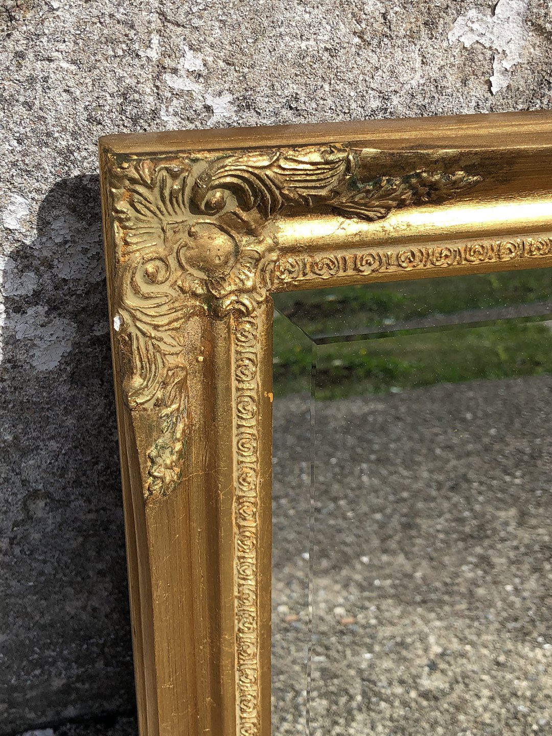 Facettierter Spiegel in goldfarbenem Rahmen. Einige Gebrauchsspuren. 84 x 54 cm