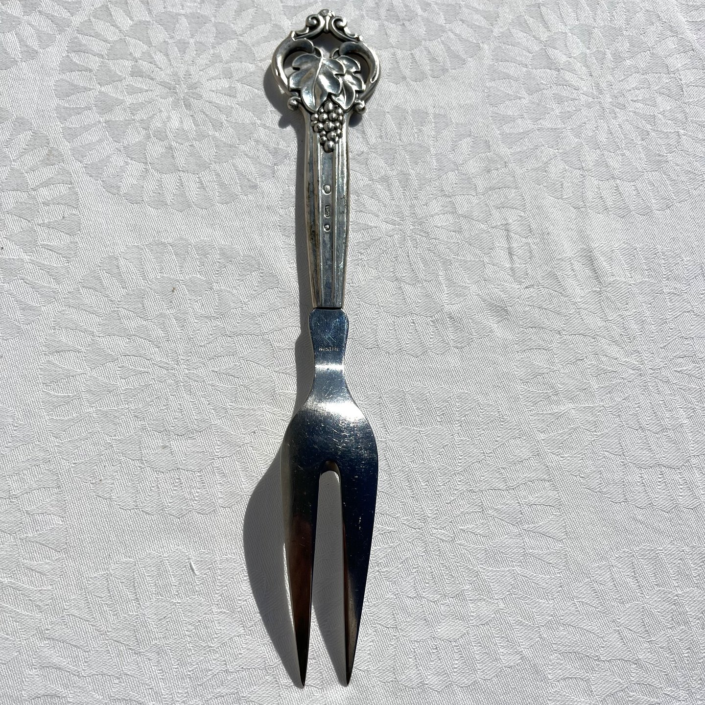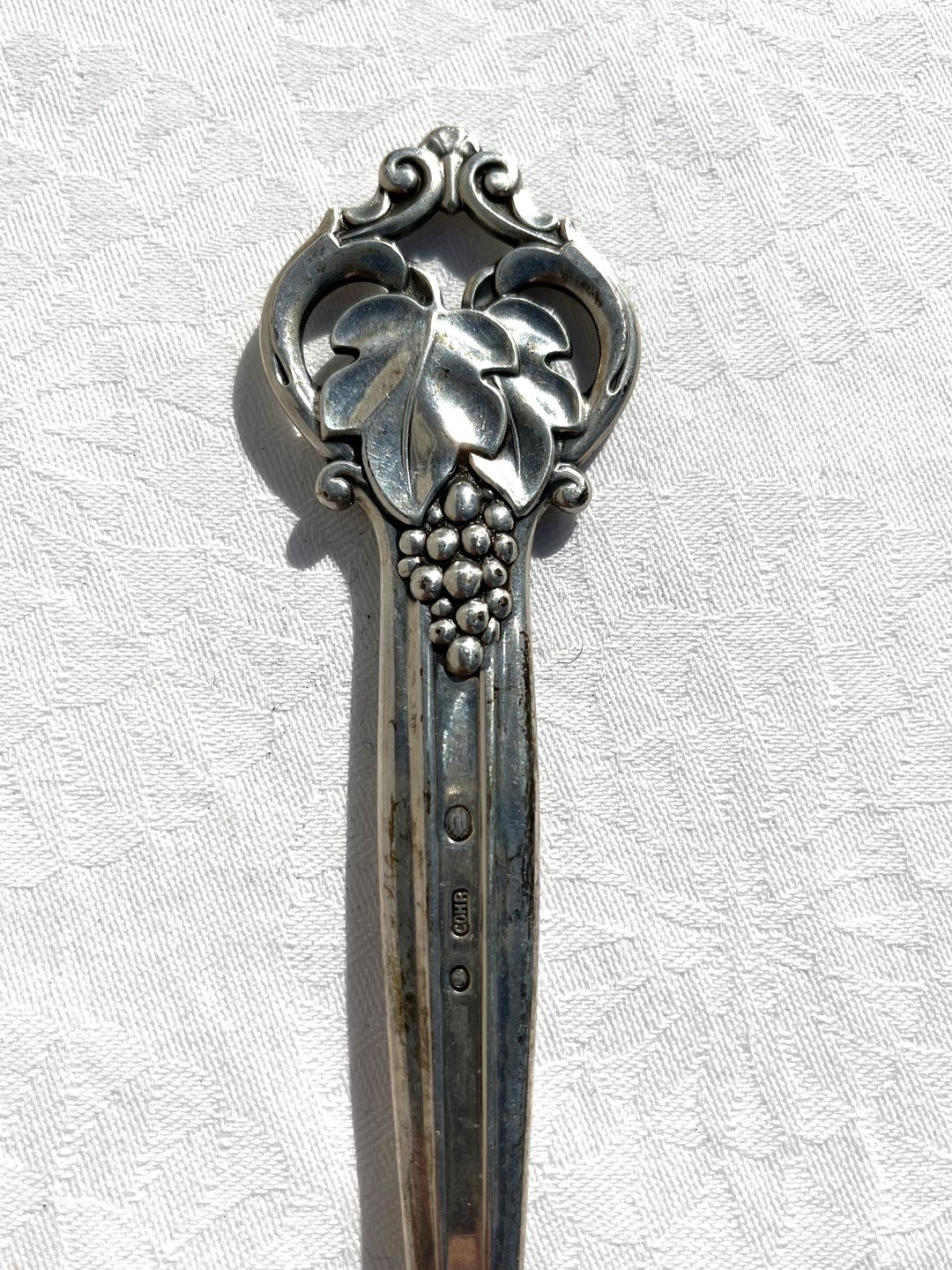 Rebe mit Weintraube aus dreitürmigem Silber (830S) und Stahl. Hergestellt 1950 in der Silberwarenfabrik Cohr. Länge 22,5 cm. Schöner Zustand