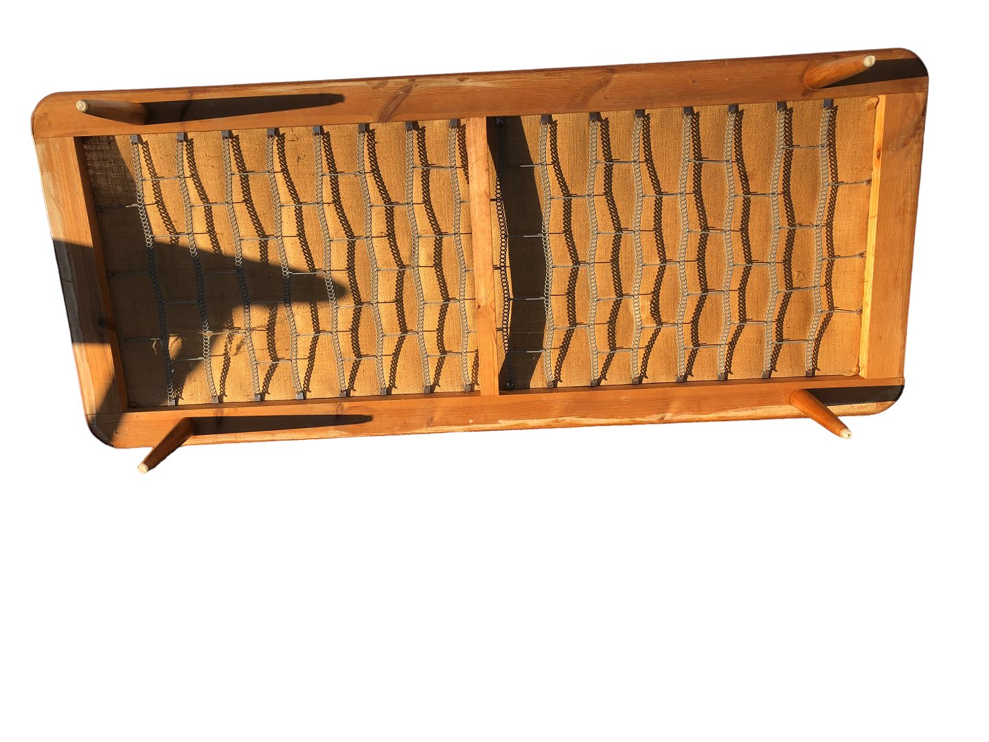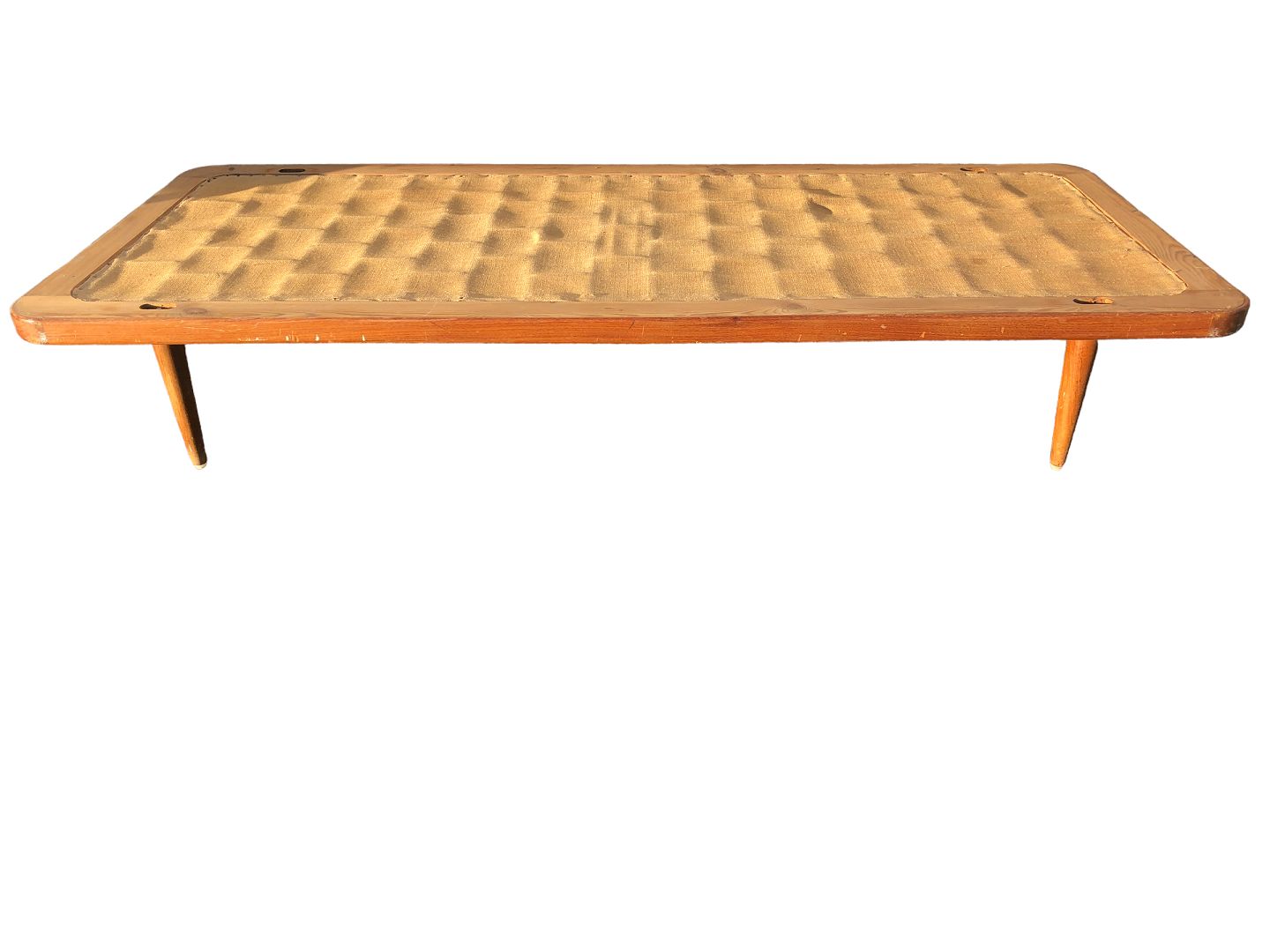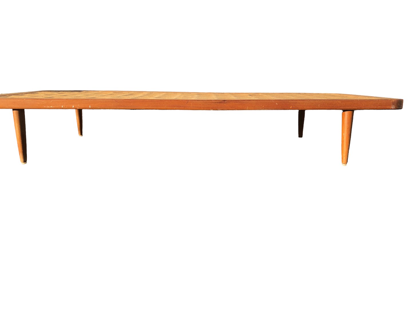 Daybed in Teakholzfurnier mit Beinen aus massivem Teakholz. Hat einige altersbedingte Gebrauchsspuren. Abmessungen: 30 x 190 x 80 cm