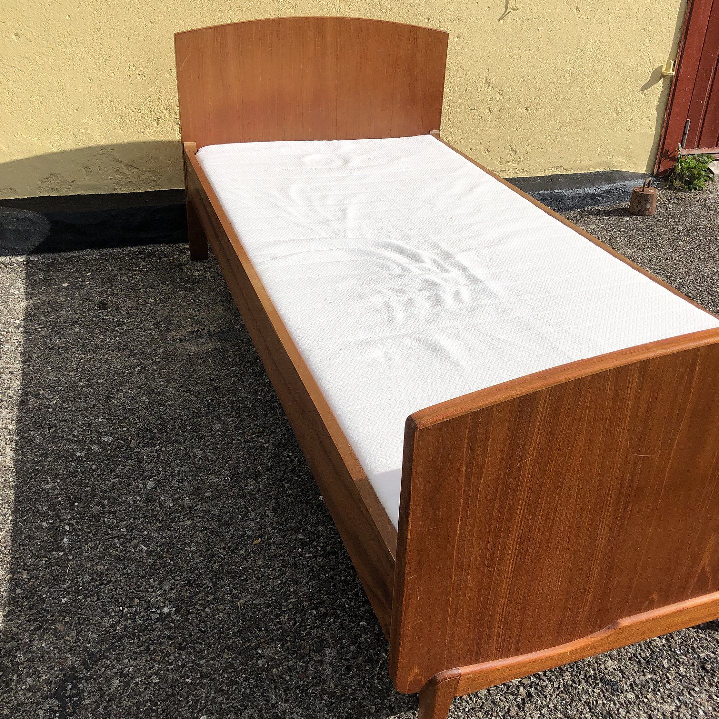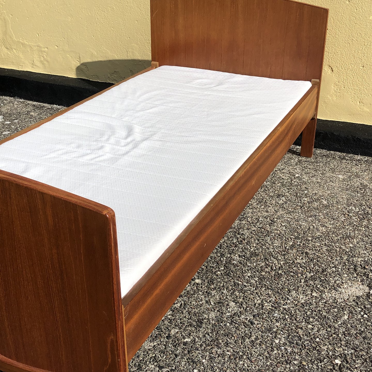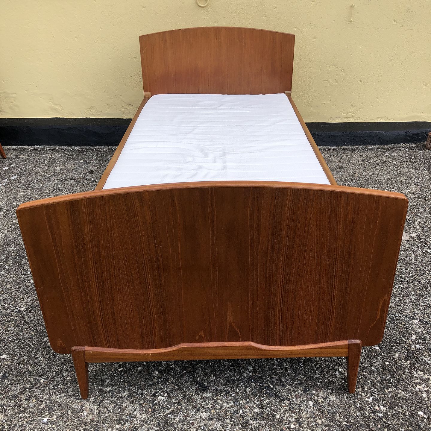 Zwei Betten in Teakfurnier, mit Lattenrost. Dänisch modern aus den 1960er Jahren. Bitte beachten Sie, dass das Kopfteil an der Wand nicht furniert ist (siehe letztes Foto) und die Betten ohne Matratzen verkauft werden. Scheint in gutem Zustand zu sein.