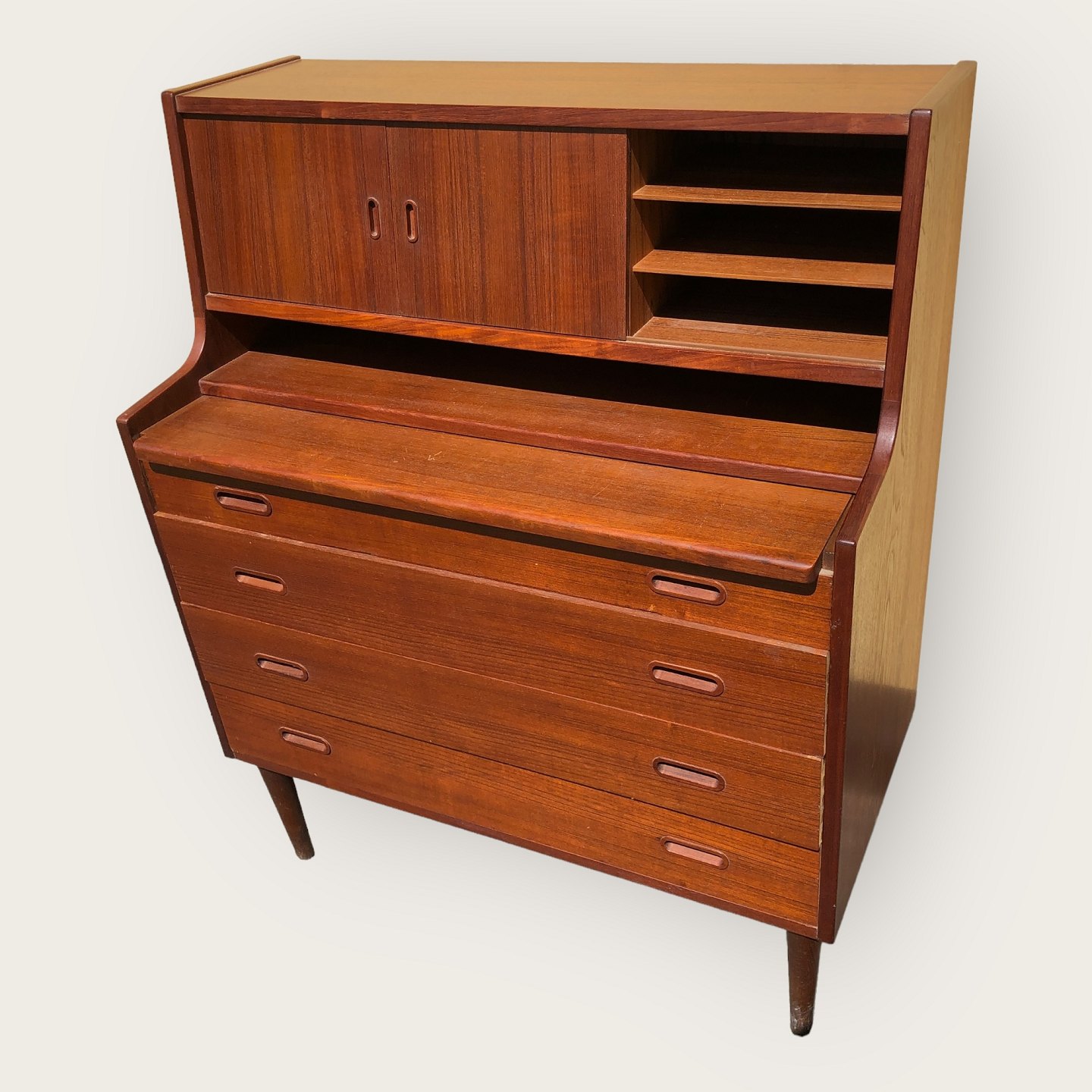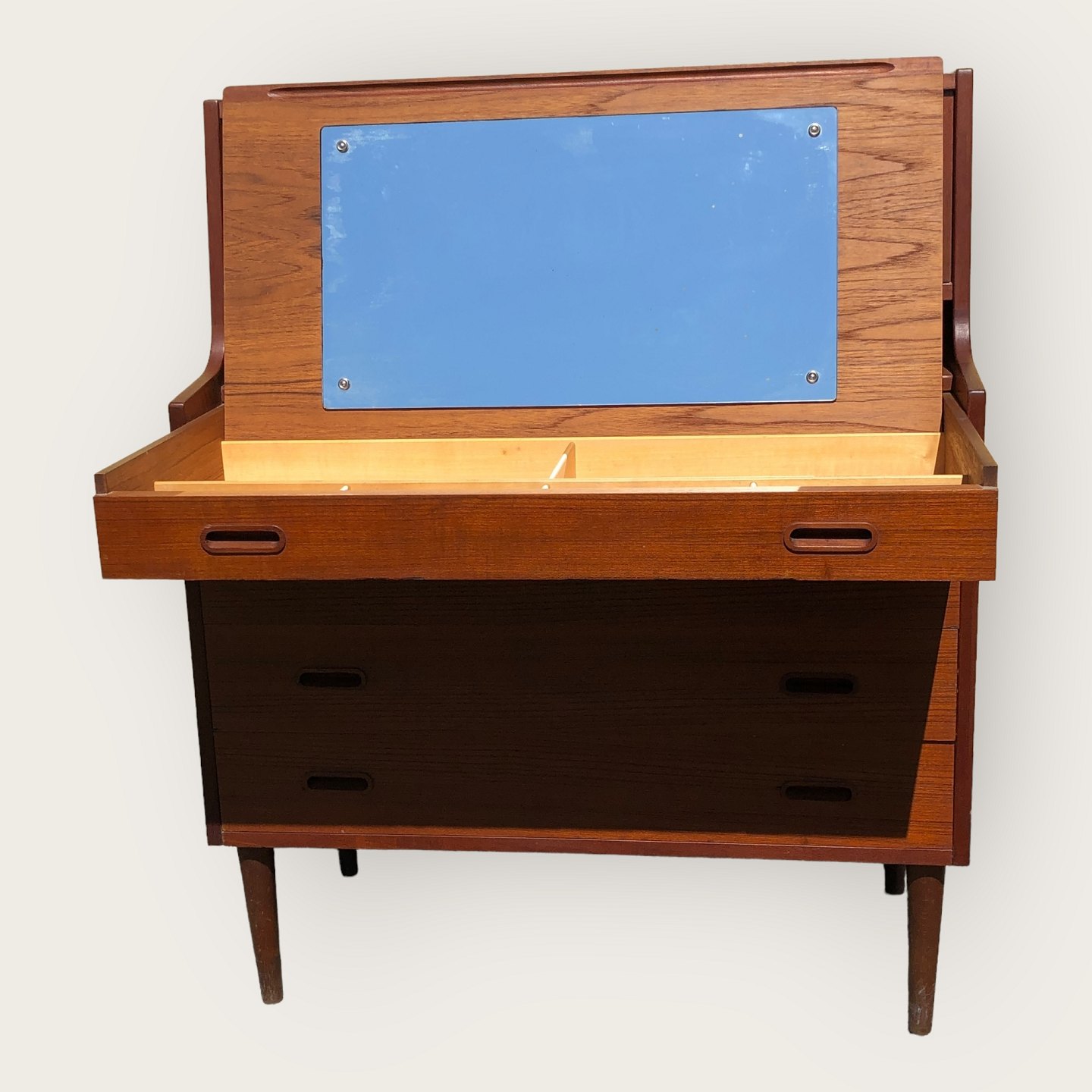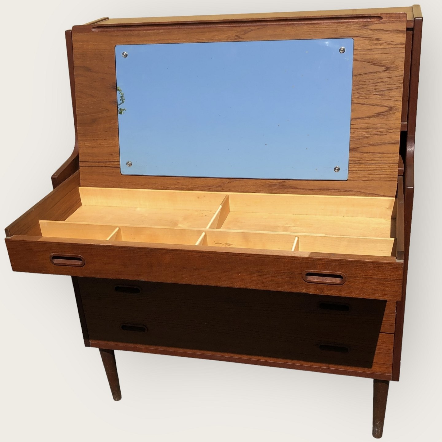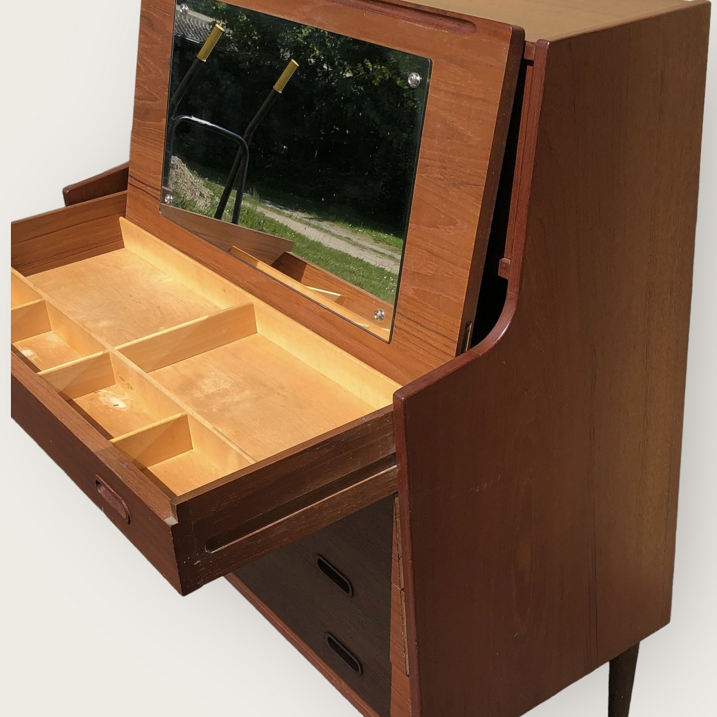 Chatol mit ausziehbarer Kosmetikschublade und Spiegel. Teakholzfurnier, dänische Moderne aus den 1960er Jahren. Erscheint in schönem gebrauchten Zustand mit ein paar kleinen Gebrauchsspuren (siehe Foto). Abmessungen: HxBxT 111x90x47 cm