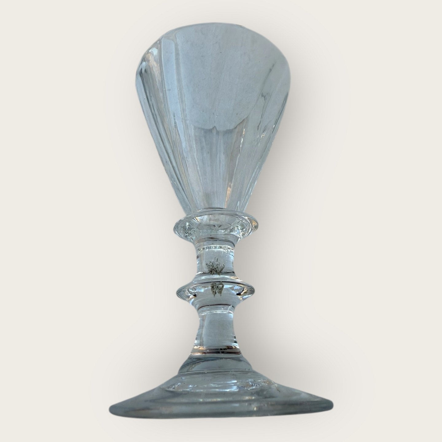 Englisch, Snerle-Twisted-Glas, Höhe 9 cm, Durchmesser oben 4,6 cm, Durchmesser unten 4,6 cm, mit kleinen Luftbläschen.