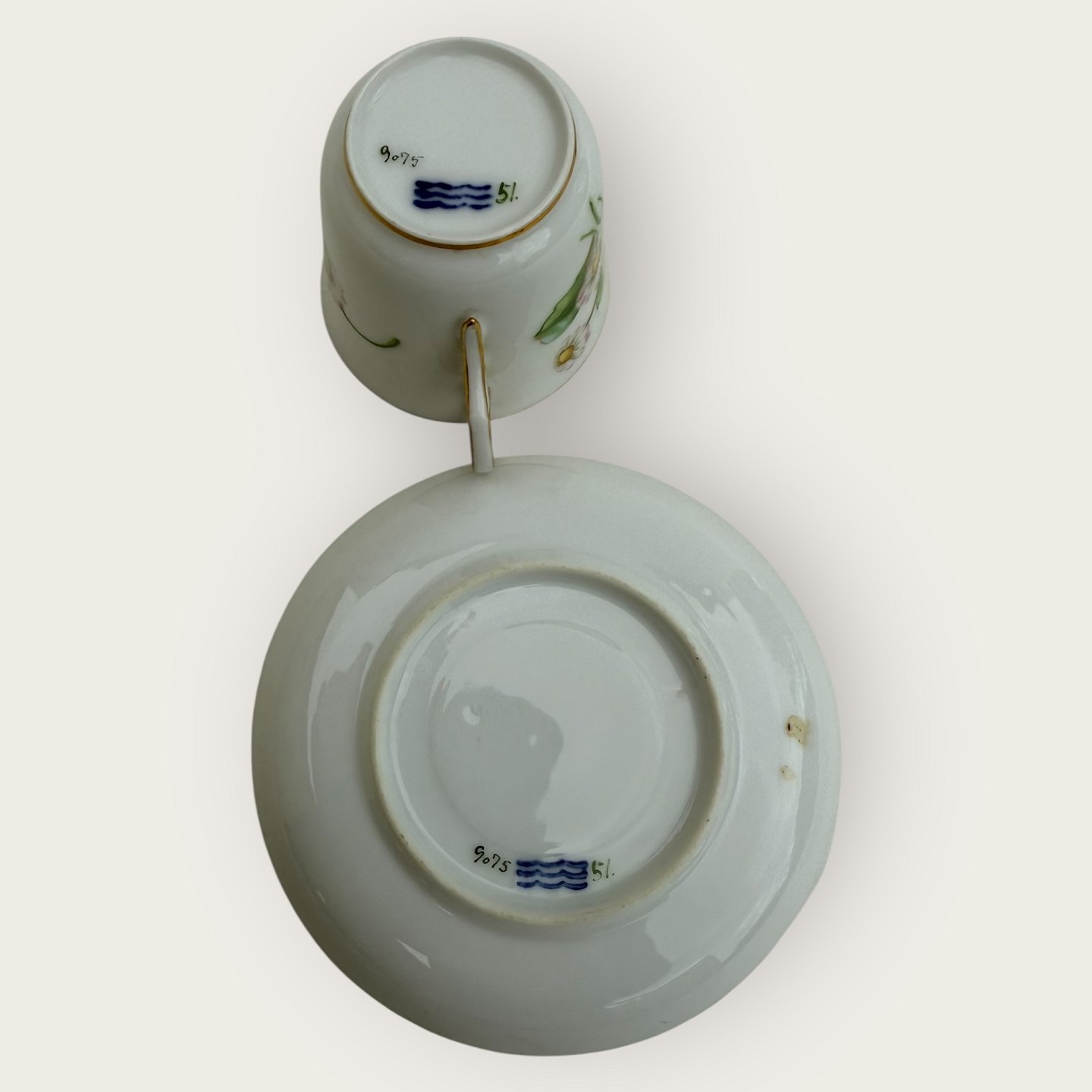Royal Copenhagen, kleine Kaffeetasse aus dünnem Porzellan, dekoriert mit Gänseblümchen, Nr. 9075, Tassenhöhe 5,5 cm, Durchmesser 6,3 cm, Untertassendurchmesser 8,5, guter Zustand