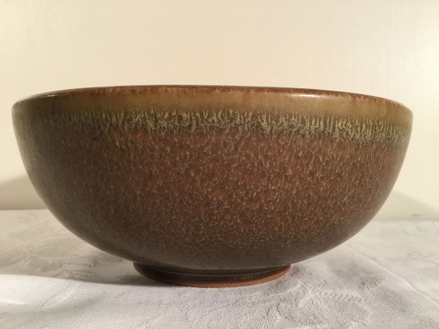 Royal Copenhagen, Unika Skål #8462/9393, 17,5cm i diameter, Design Nils Thorsson *Brun & Grøn nisteret glasur der løber sammen, Perfekt stand*