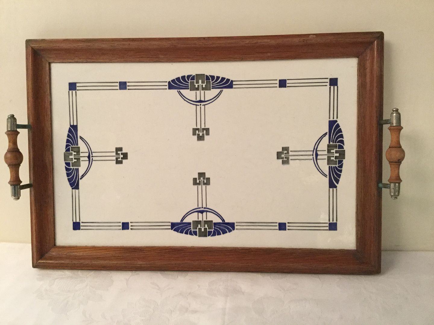 Porcelæns bakke med egetræsramme og træhåndtag. 43x28 cm. Fin stand. Antagelig fra Tyskland.