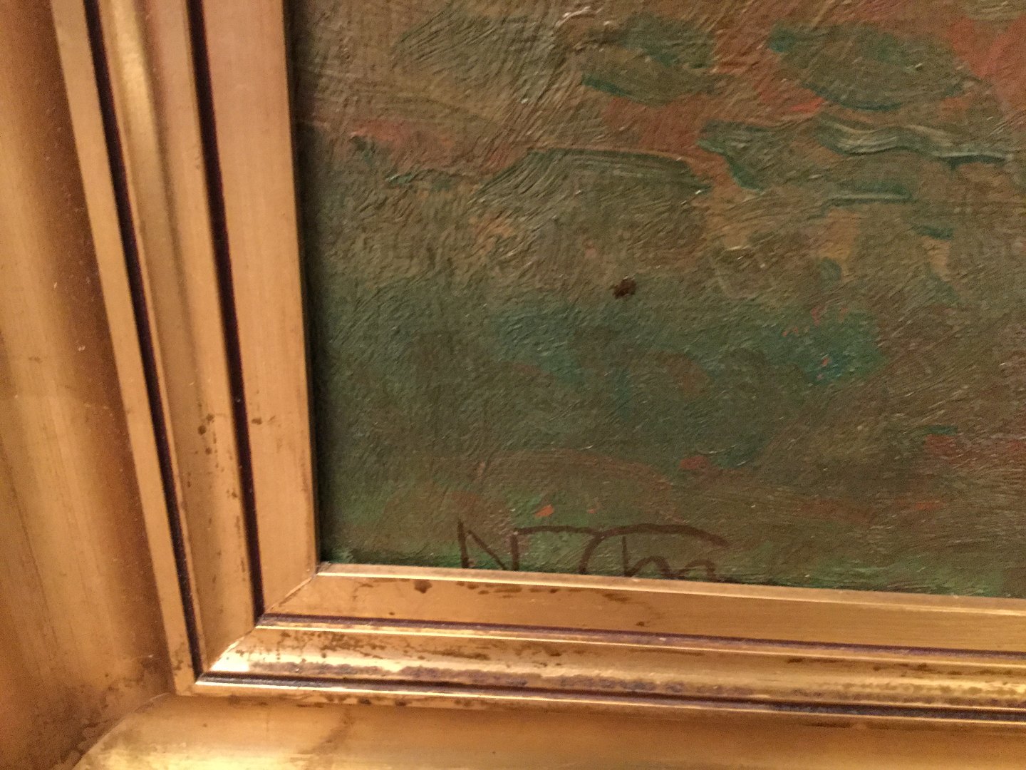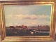 Niels Christiansen, Heste og gæs på Saltholm med antydning af København i baggrunden, 95/66cm uden ramme, 114/85cm med ramme, Signeret: N. Chr. *Rammen med farveforskel ellers pæn stand*