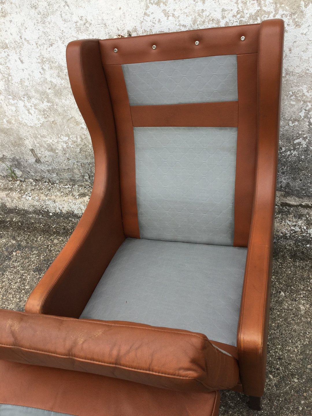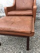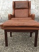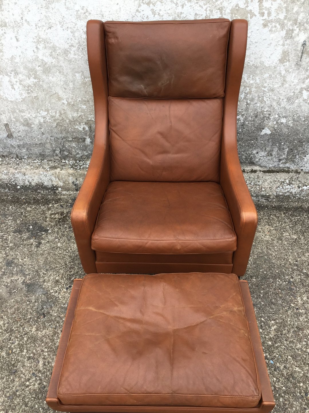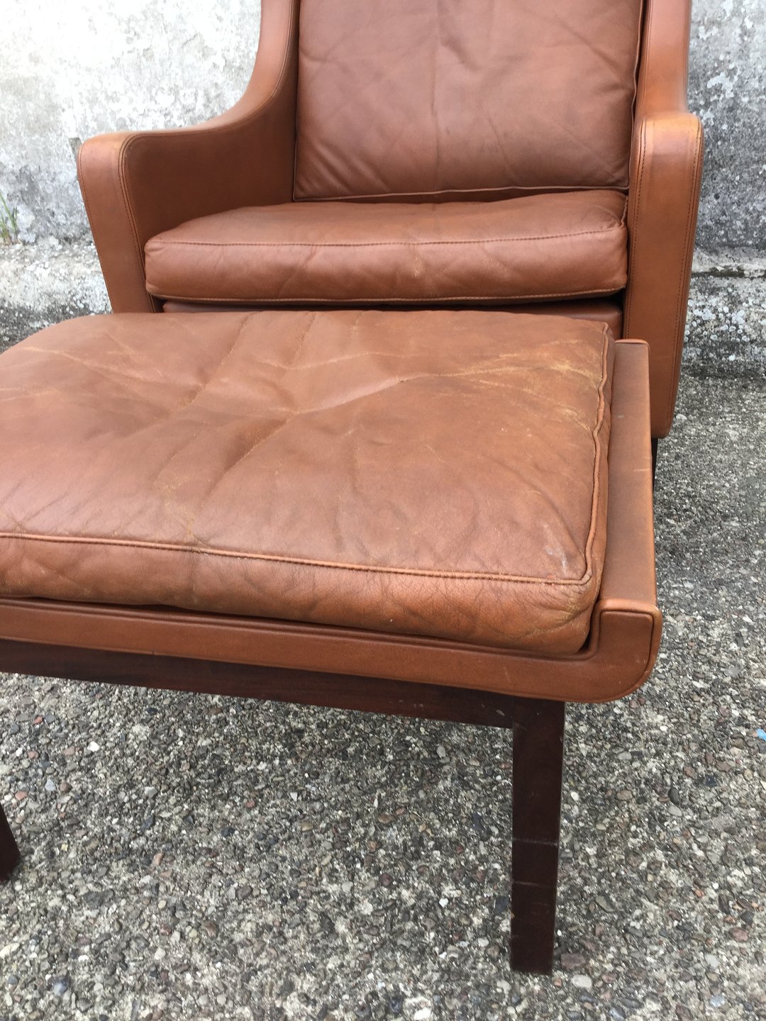lænestol i læder med fodskammel. Fra ca. 1970, Stolen er med patineret læder / Brugsspor.