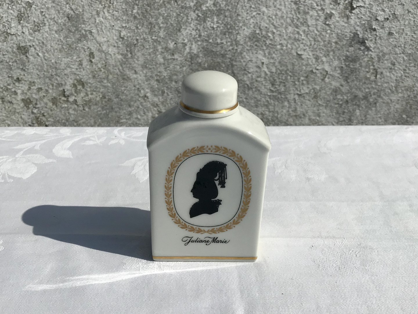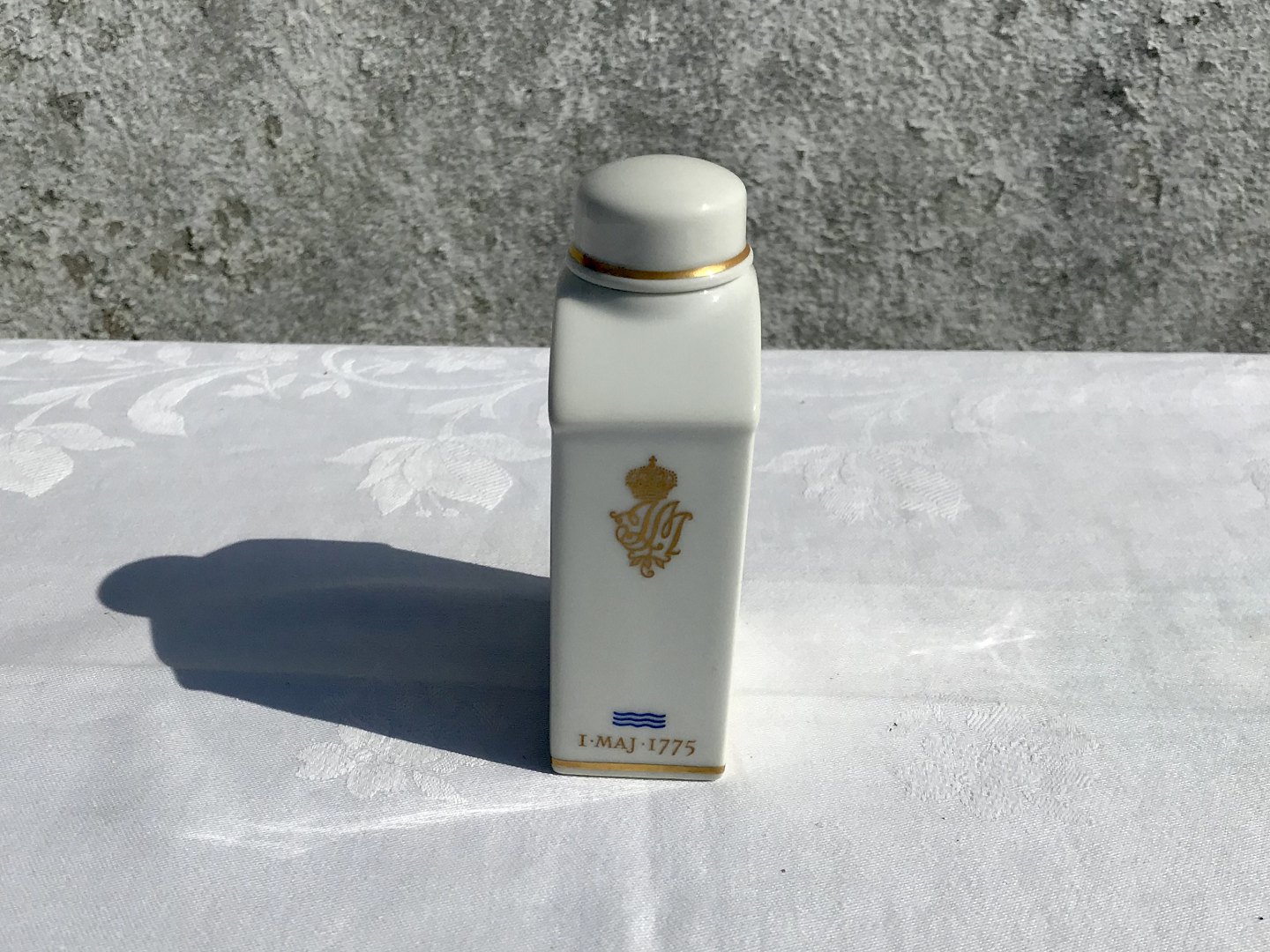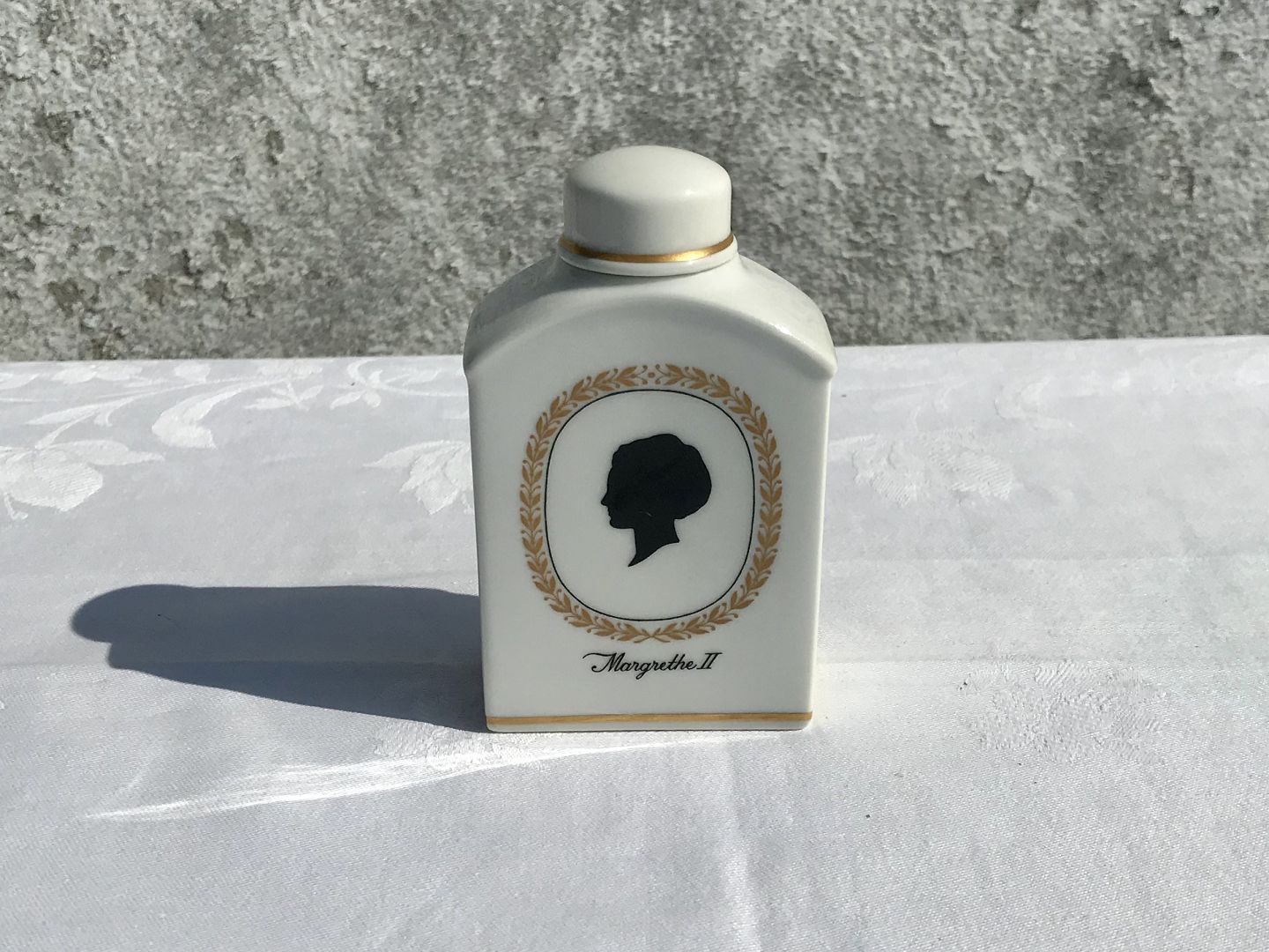 Royal Copenhagen, Låg krukke, te dåse, 200års jubilæum 1775 - 1975, Juliane Marie og Margrethe d.II, 11cm høj, 6,5cm bred, 3,5cm dyb, 1.Sortering *Perfekt stand*
