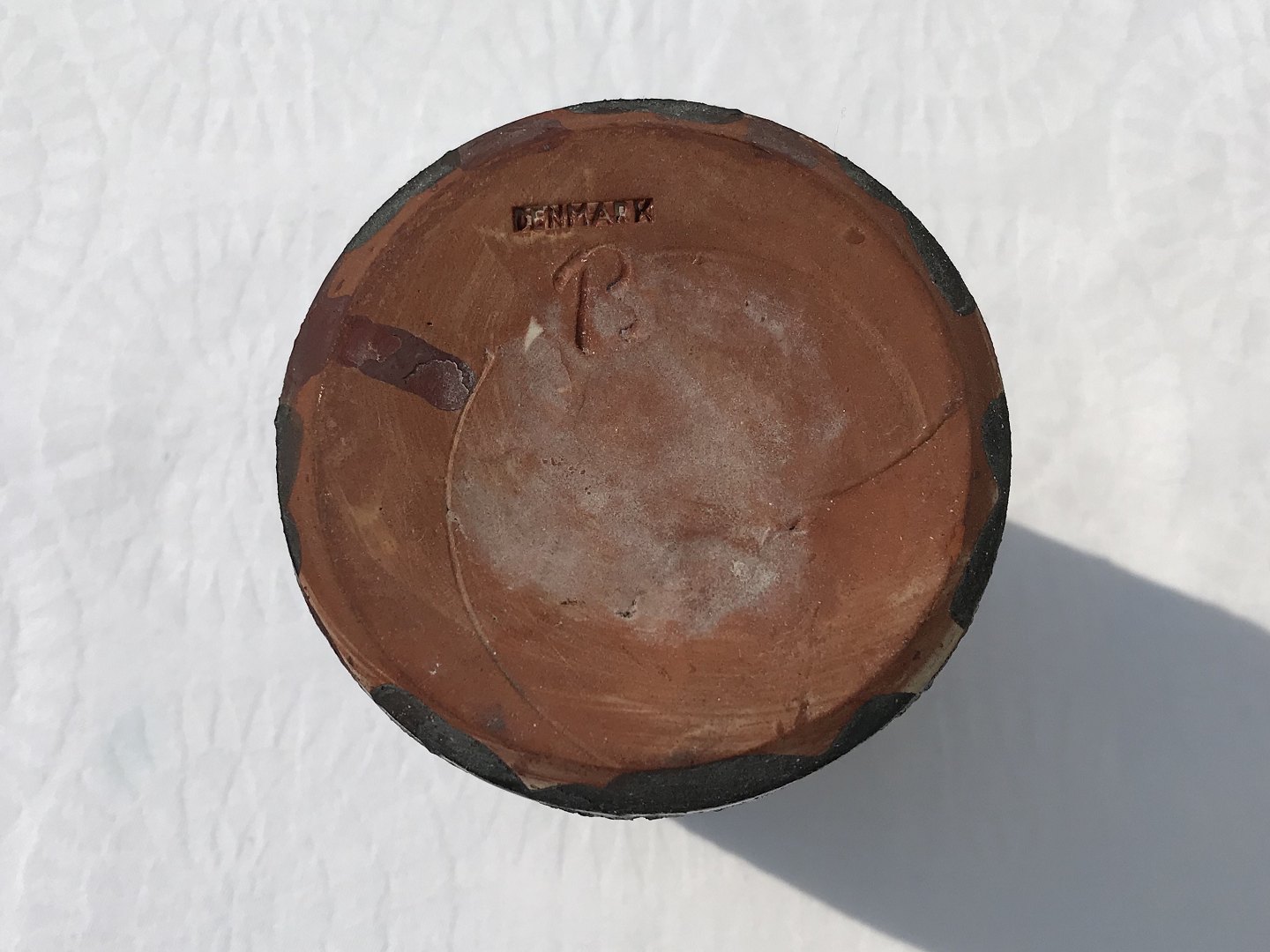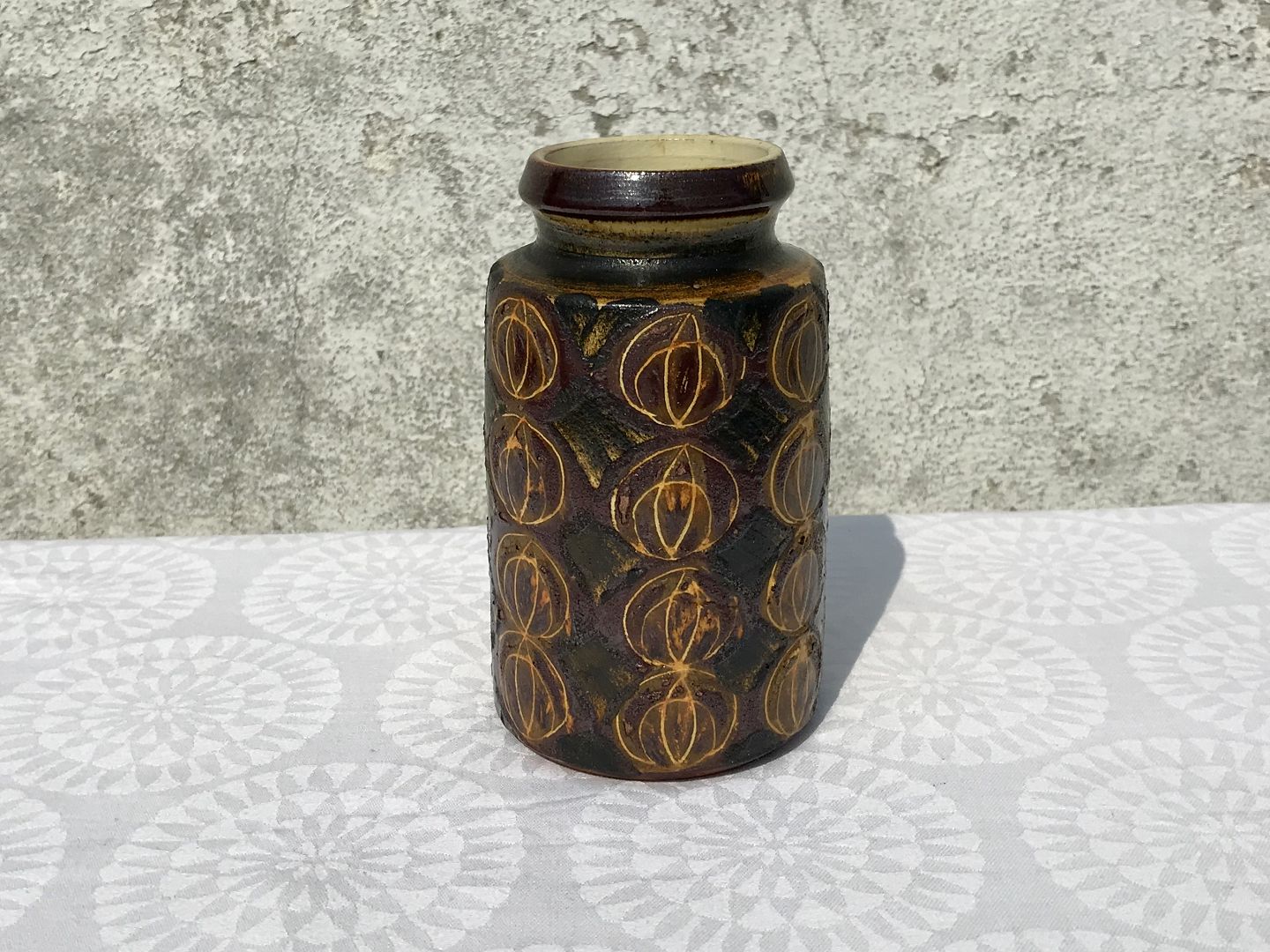 Keramik vase, 15cm høj, 8,5cm i diameter, med cirkel dekoration, Signeret: B, Danmark *Pæn stand*