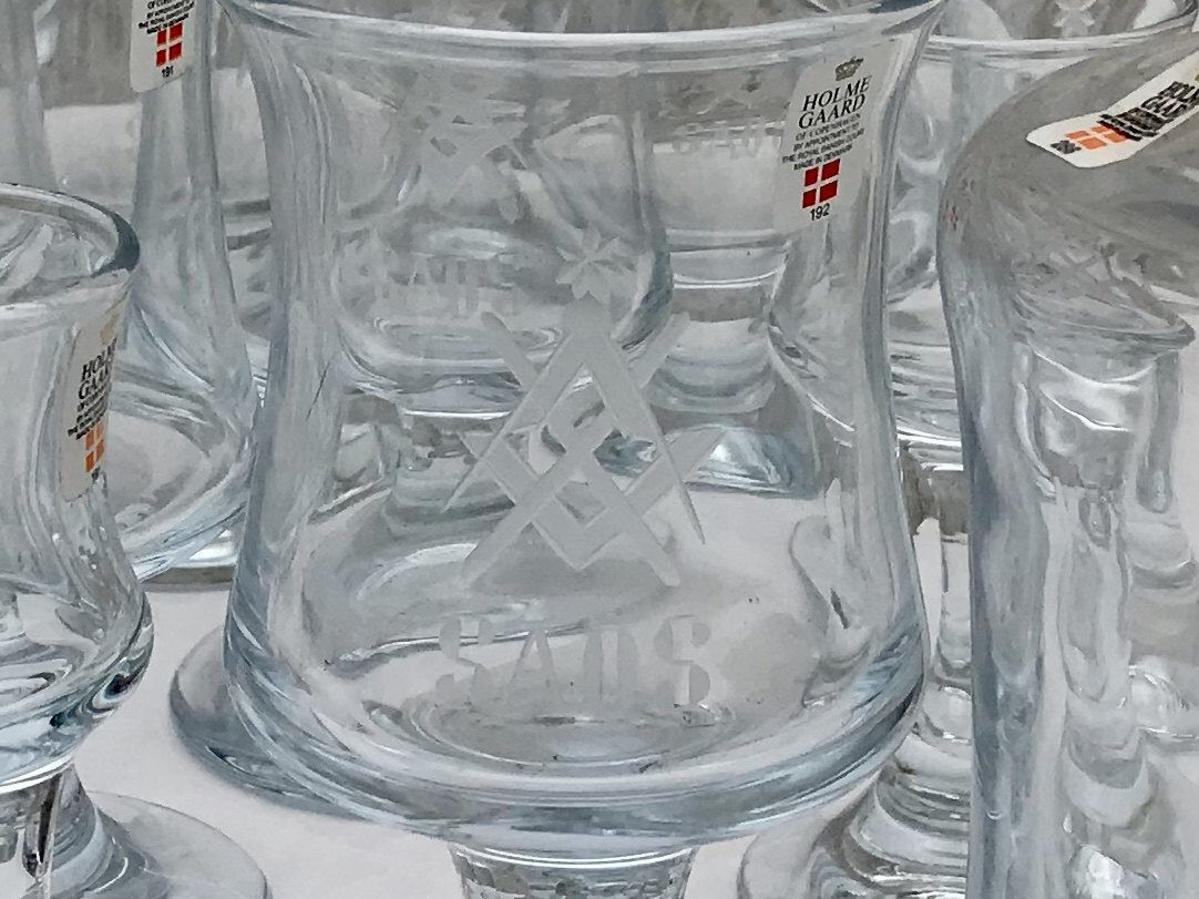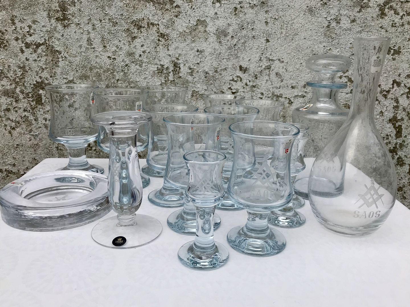 Holmegaard, Graverede ordensglas, Skibsglas med gravering, Sankt Andreas ordenen, 17 dele glas, Askebæger, Karaffel, Fogliet, Lysestage, Design Per Lütken *Perfekt stand*