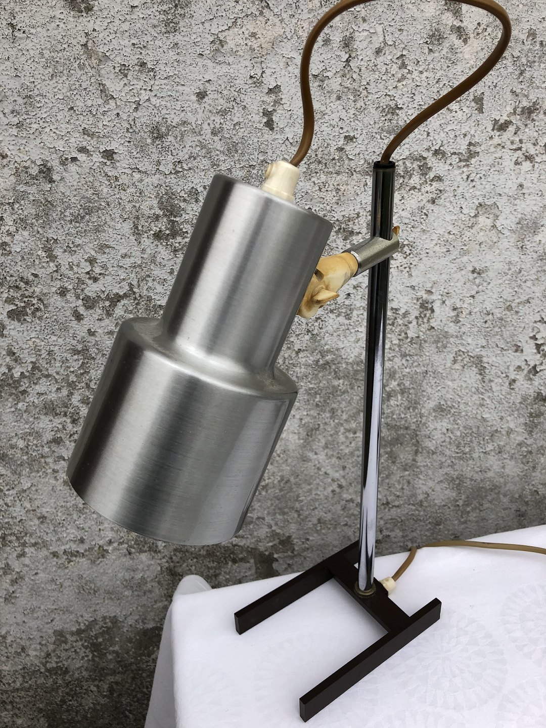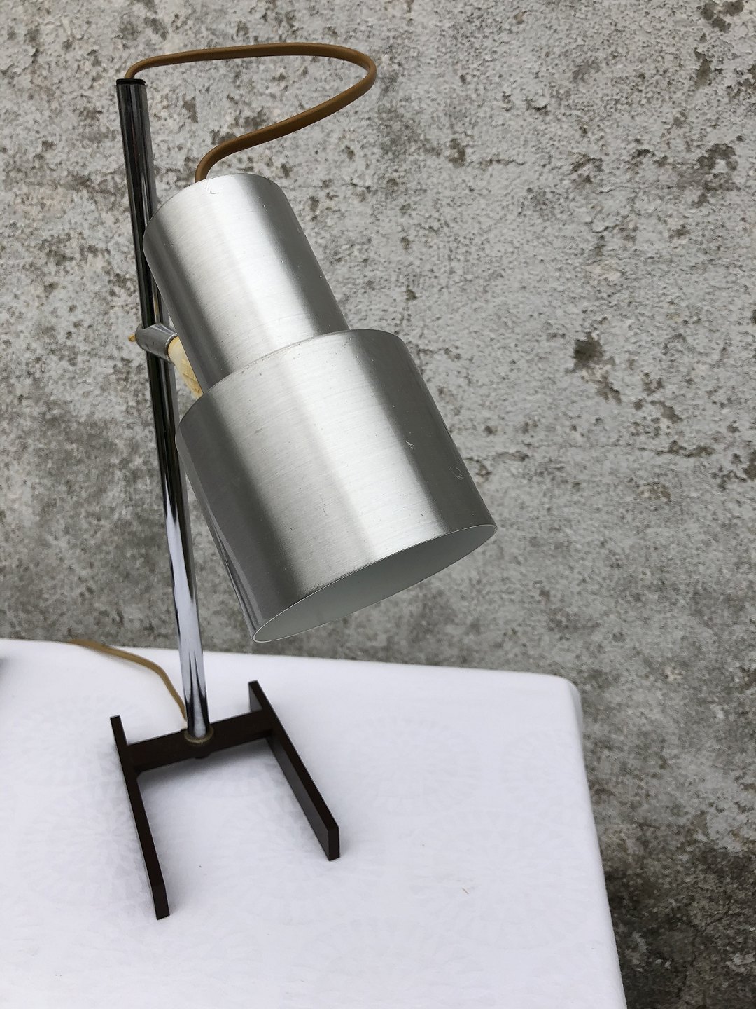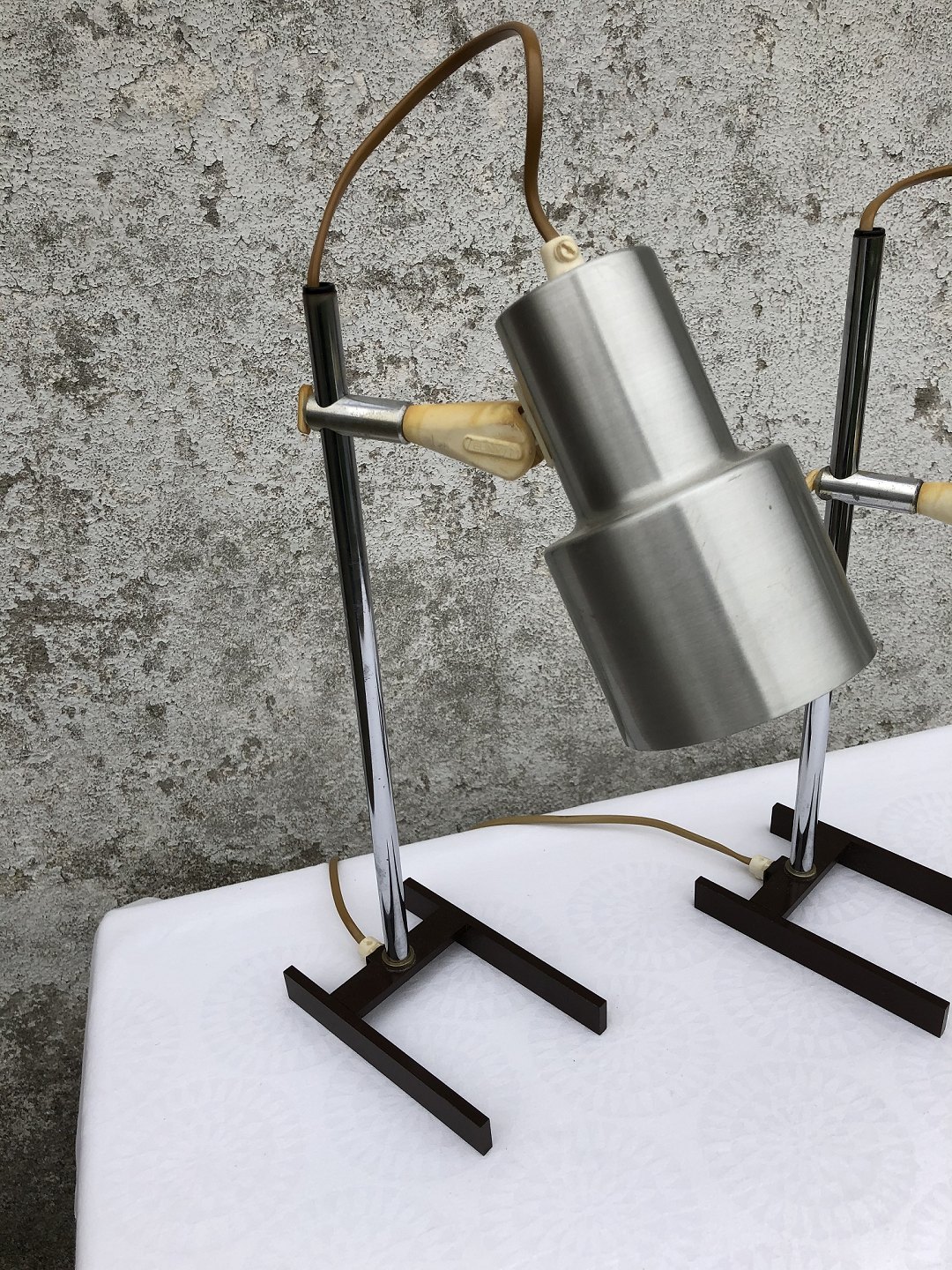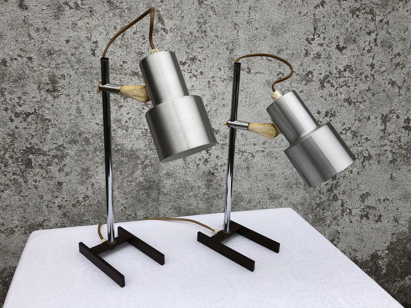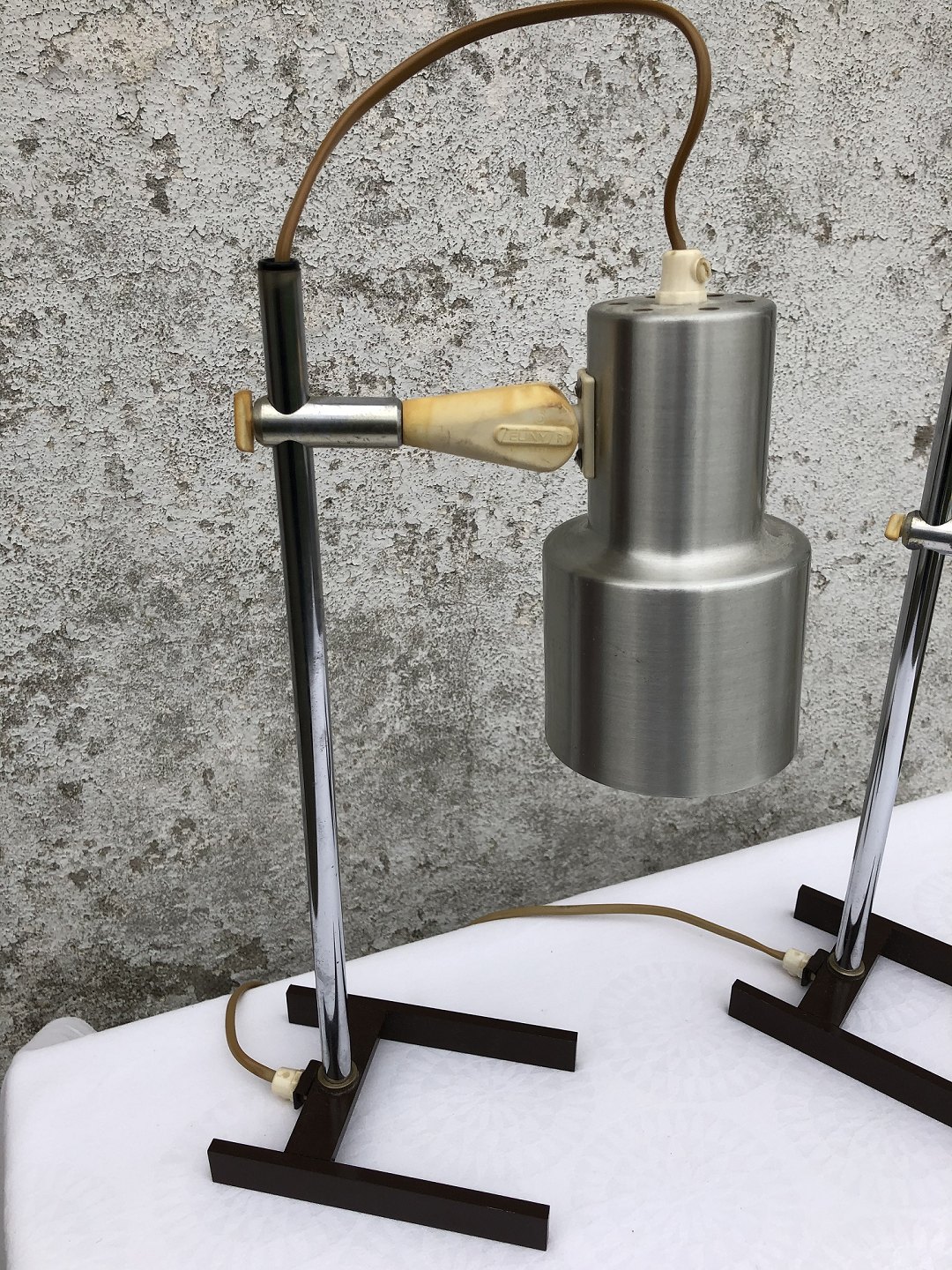 Bordlamper i metal, hvid plast. Fremstår let gulnede i plast og ledninger, ellers pæn stand.