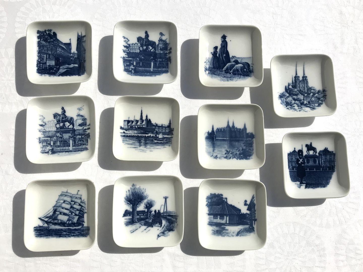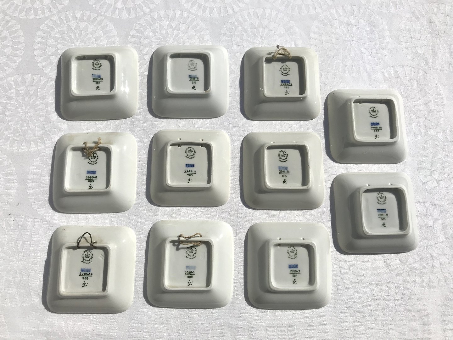 Royal Copenhagen, 11 stk, Små Danmarks platter #2985/985, 8,5/8,5cm, 3.sortering *Pæn stand* Sælges samlet