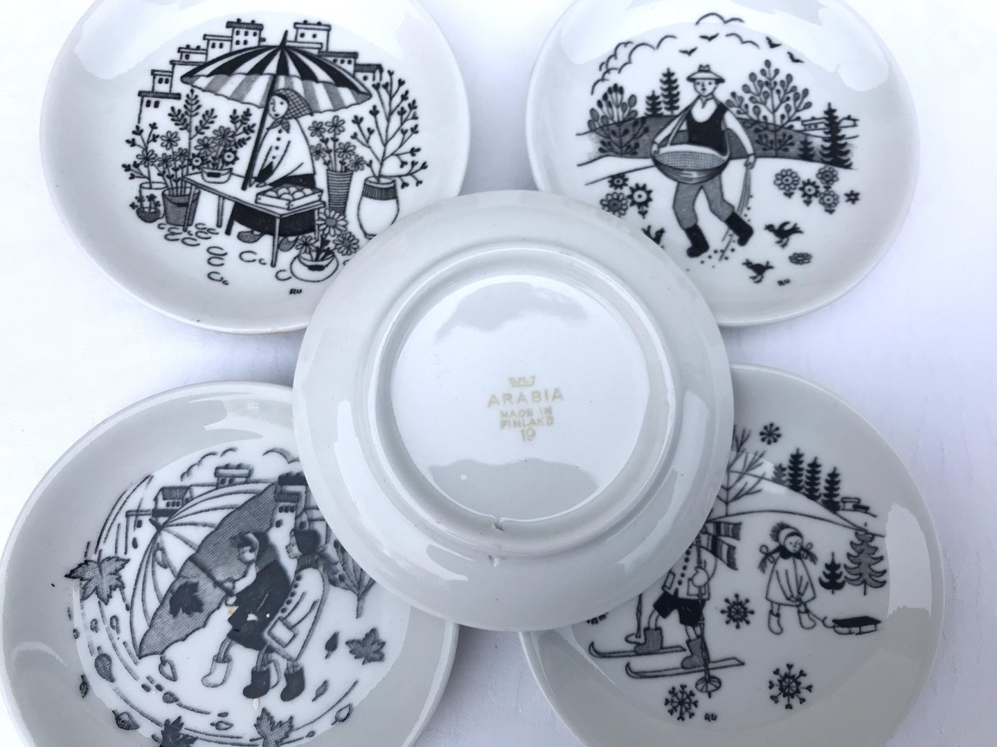 Arabia, 5 små platter, 9cm i diameter *Med små glasurfejl*