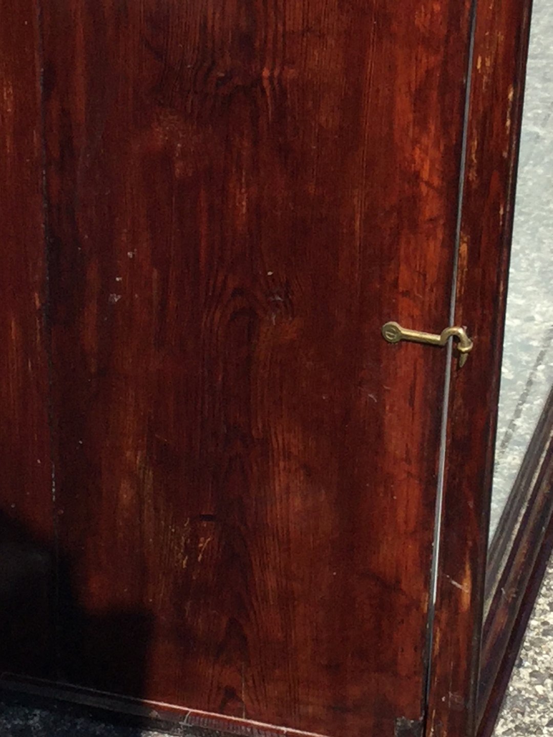 Mørkt lakeret træskab med glaslåge, indvendigt med grå bemaling. Pæn stand. Mål: HxBxD 60x58x37 cm