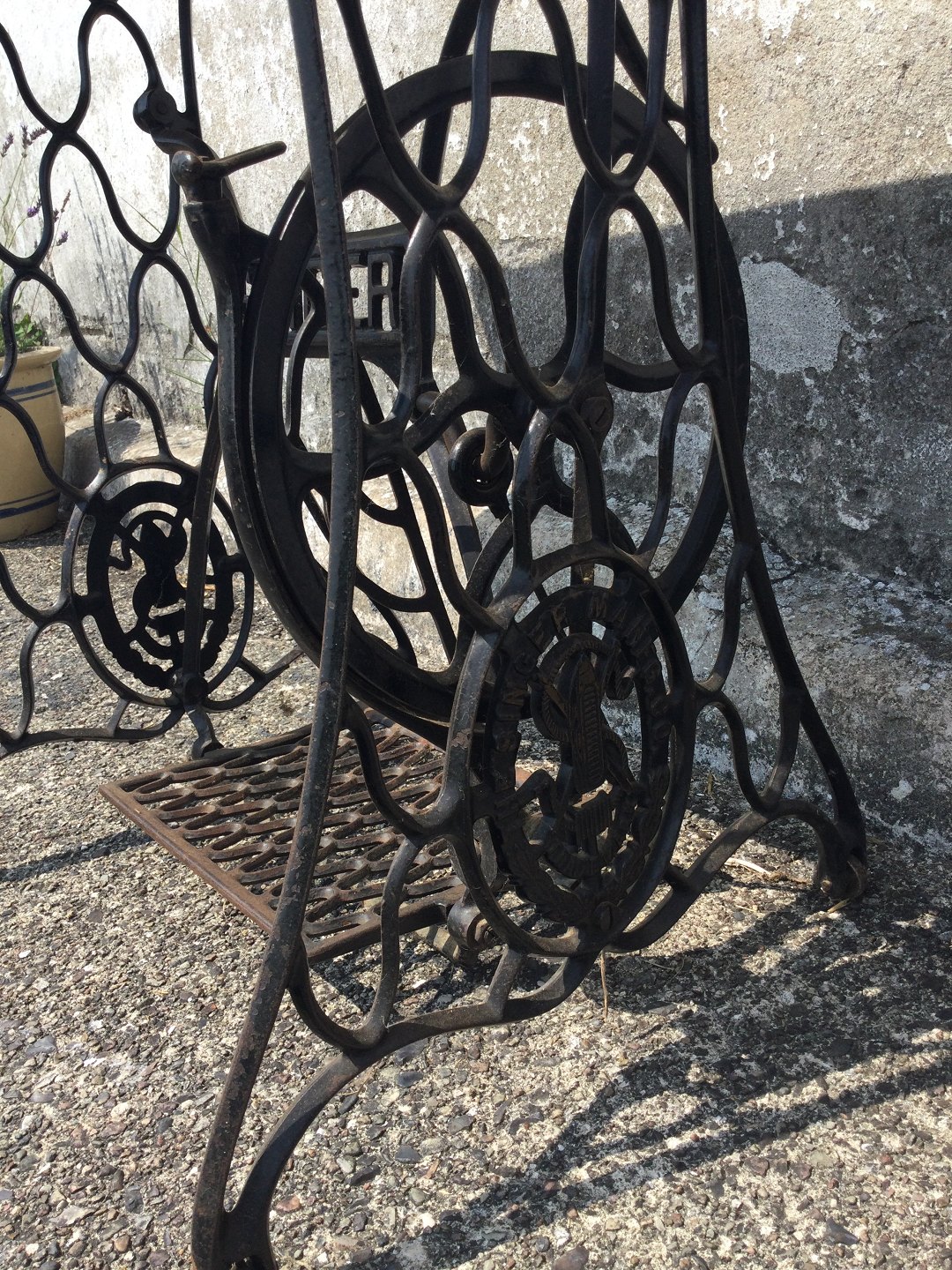 Symaskinebord i metal med senere marmorplade. Mål: HxBxD 74x95x45 cm