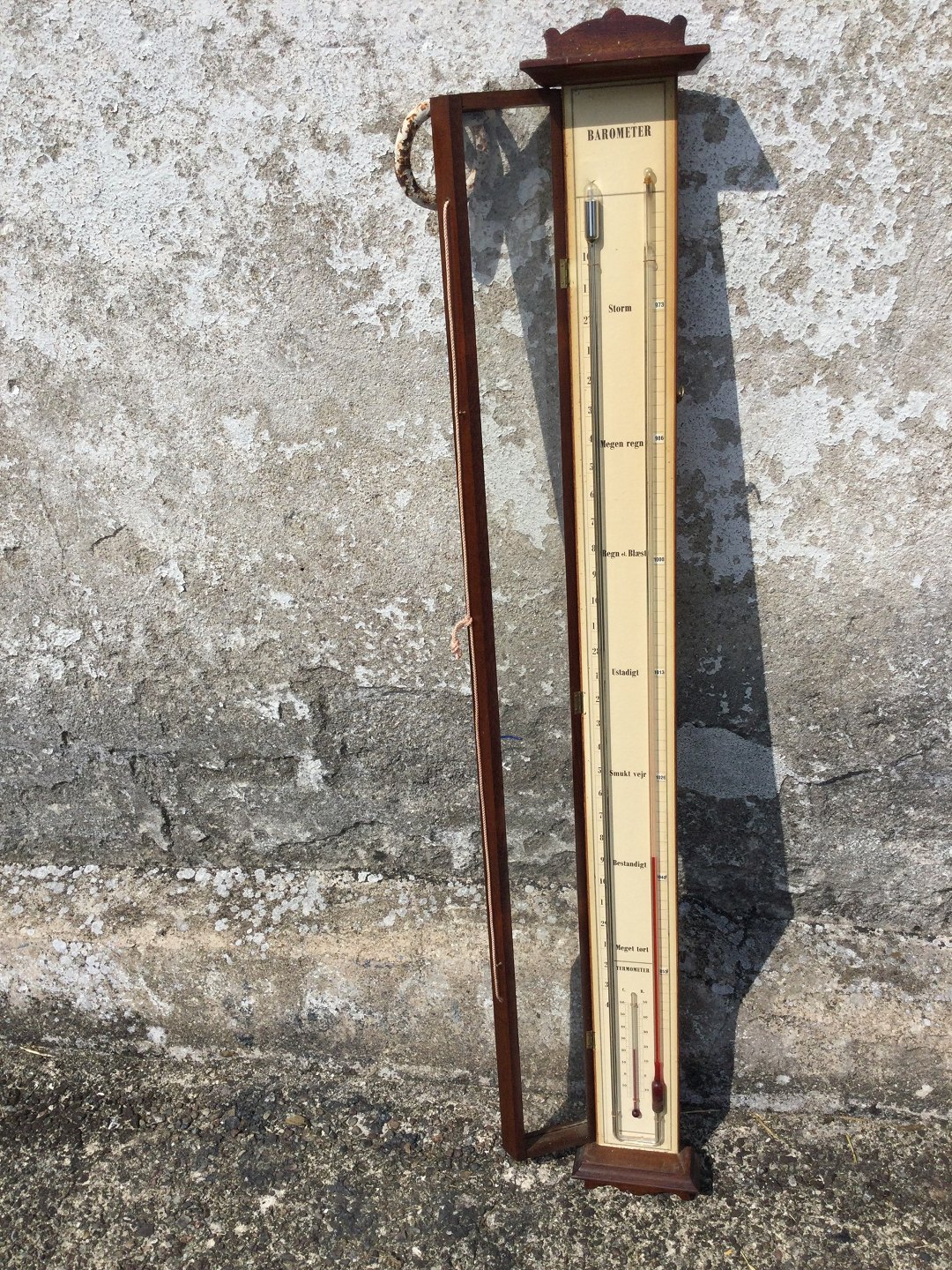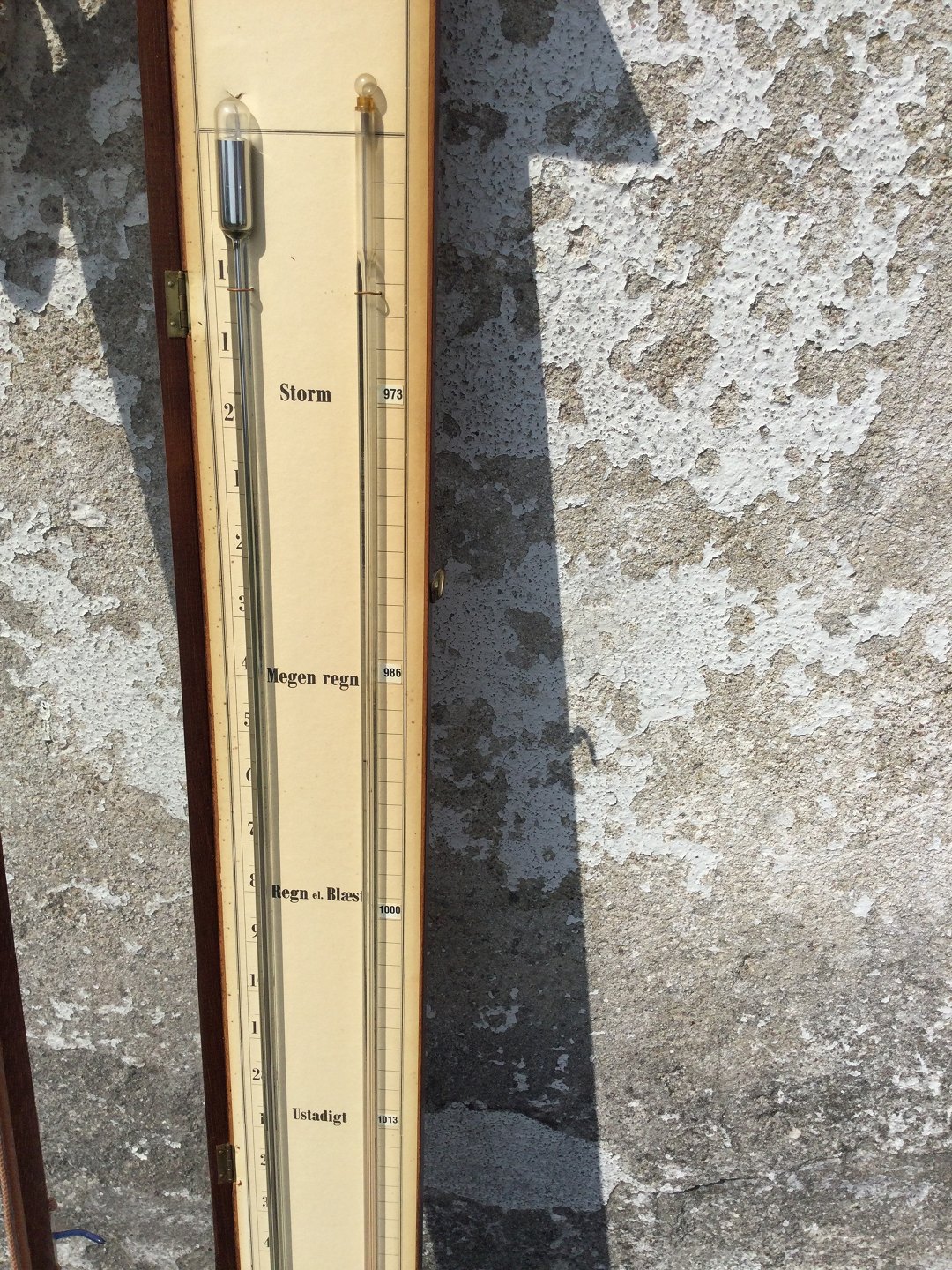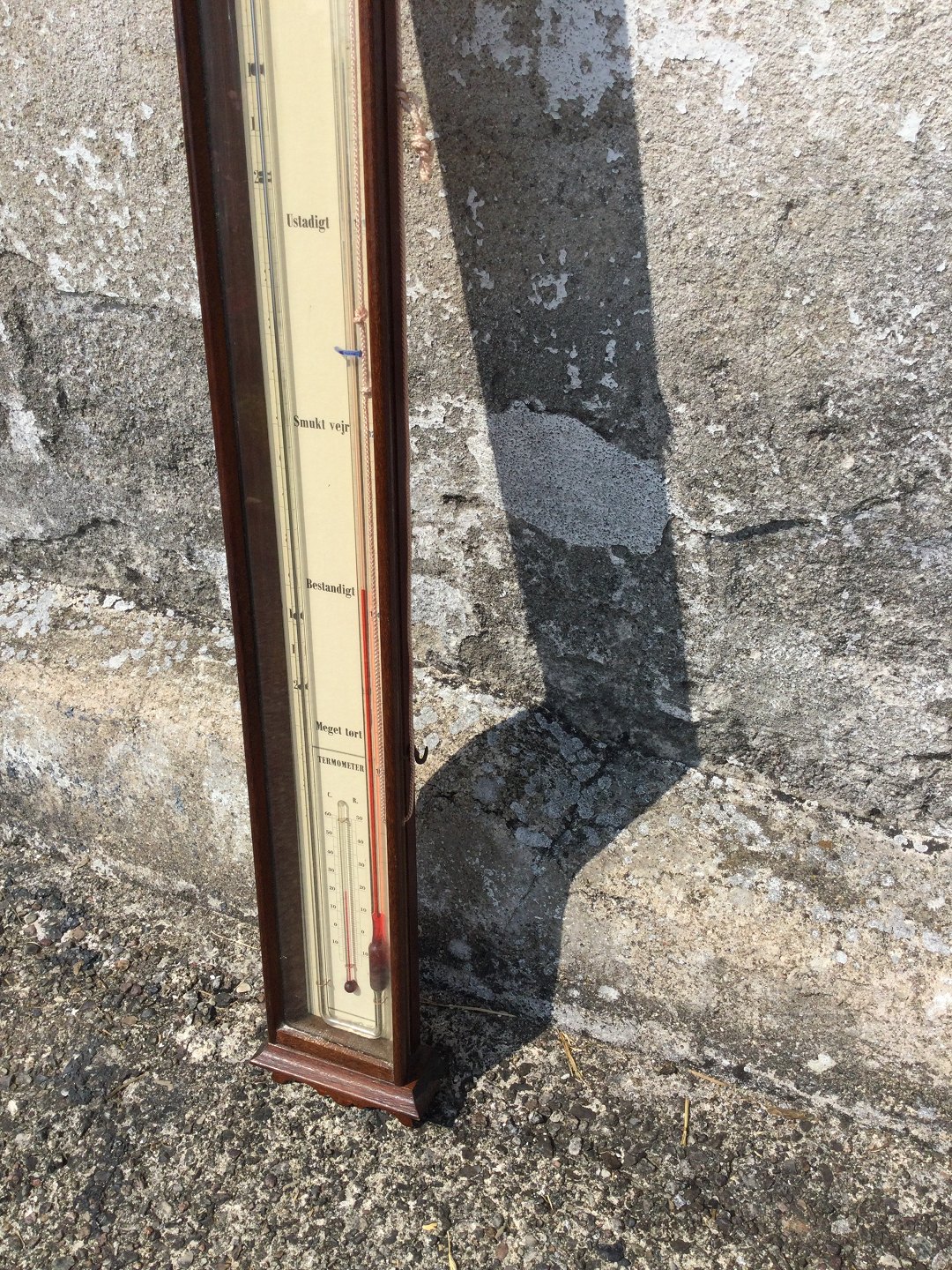 Stavbarometer med kviksølvsøjle og termometer i trækasse. Højde 100 cm. Pæn stand. Utydeligt mærket på bagsiden fra Nordisk termofabrik 2900 Hellerup.