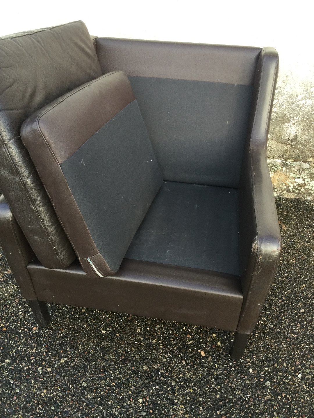 Lænestol i brunt læder med mørkbejdsede ben. Danish modern. Stolen har patinering / Brugsspor.