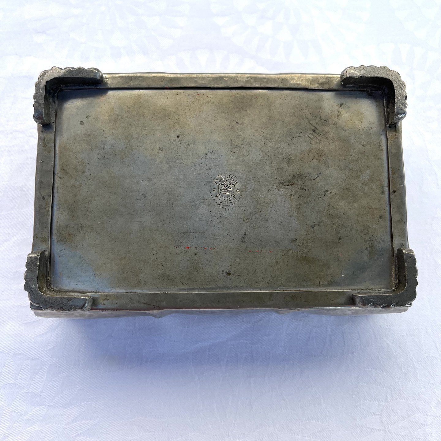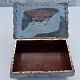 Tin æske, 15,5cm bred, 10,5cm dyb, 5,5cm høj, Stemplet Dansk kunst *Pæn stand*