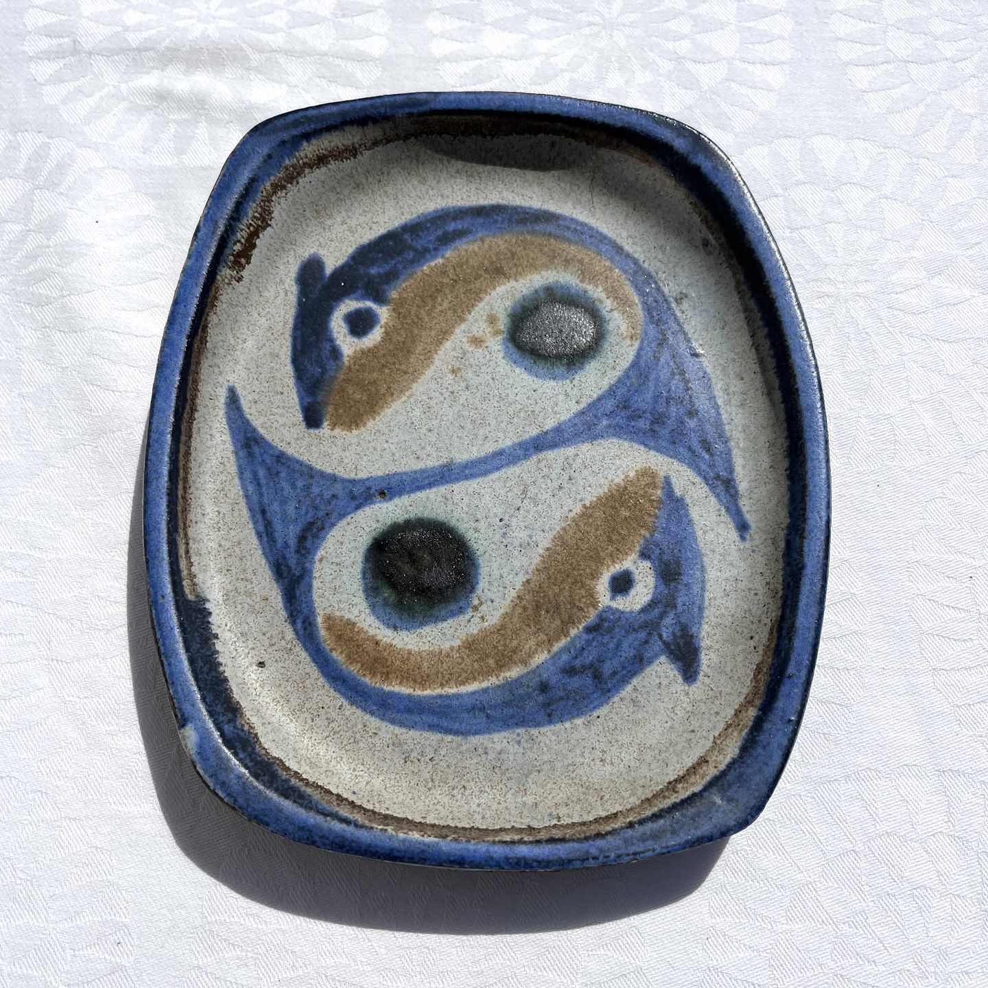 Helge og Rie Jacobsen. Keramik fad med fiskemotiv, 17cm lang, 14cm bred. Pæn stand.
