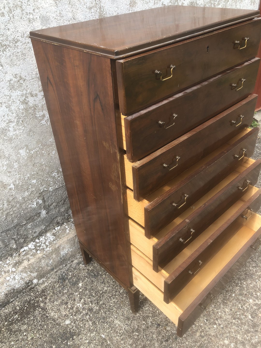 Kommode i lakeret nøddetræsfiner. Fremstår med aldersrelaterede brugsspor. Mål: 118x70x43 cm