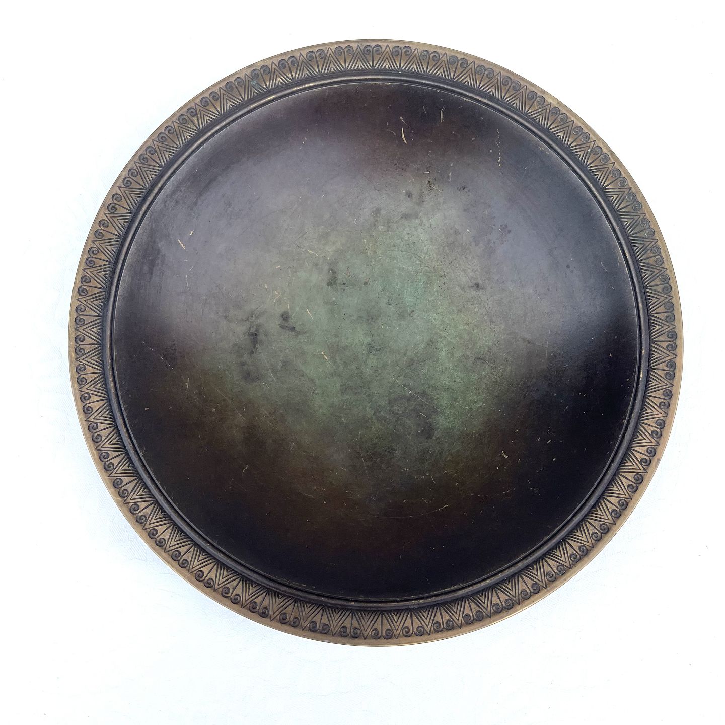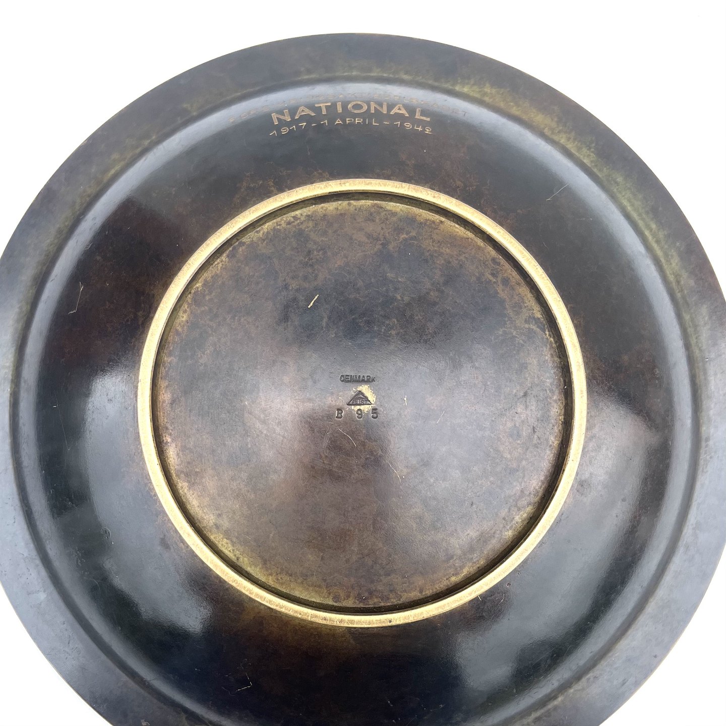 Just Andersen, Bronze fad, Med inskription, 23,5cm i diameter, Stemplet B95 Just *Med brugsspor*