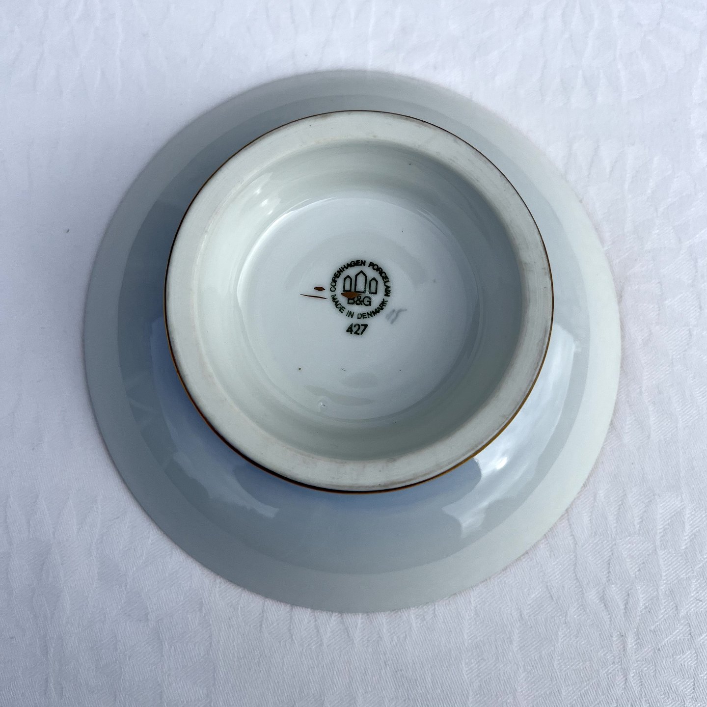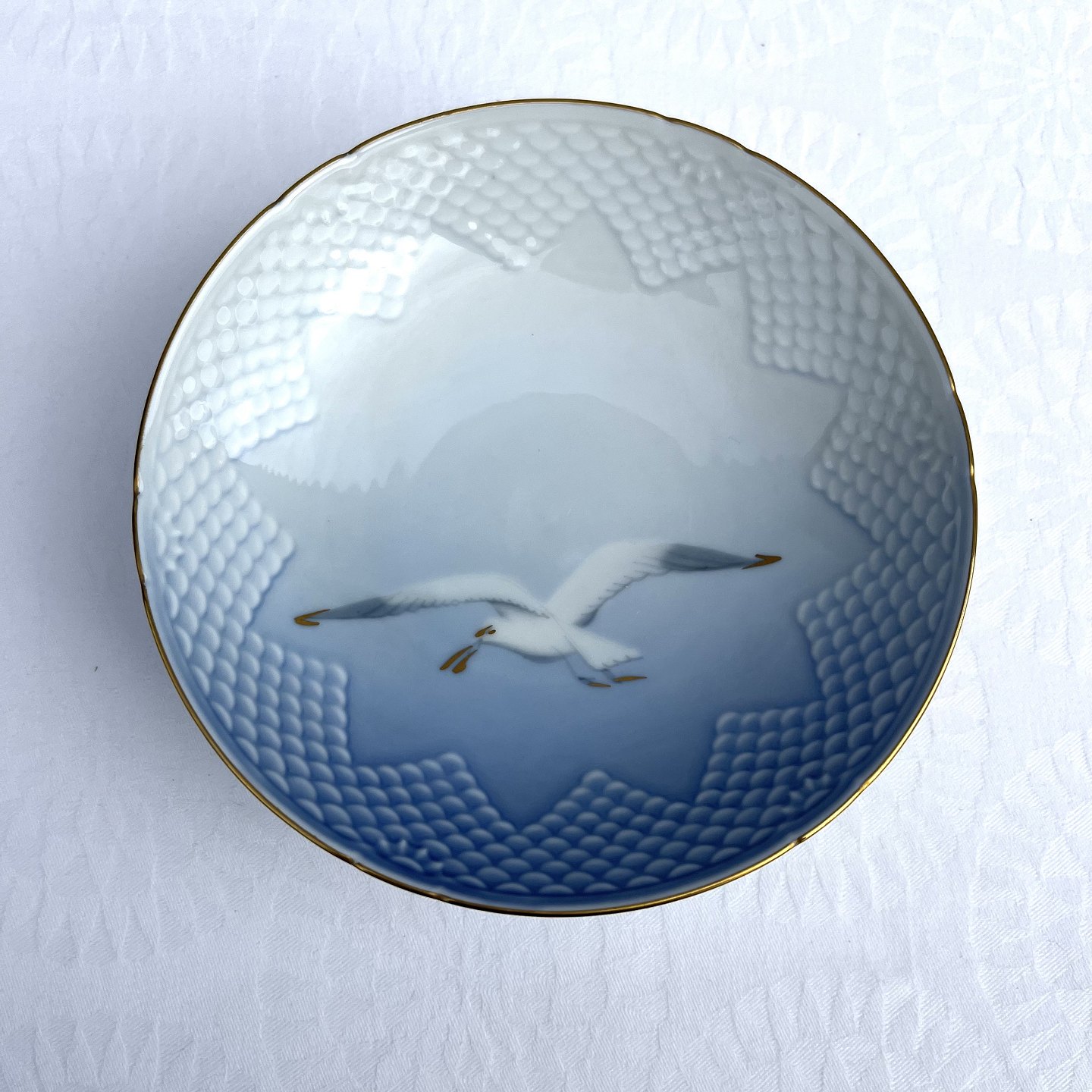 Bing & Grøndahl, Måge med guld, Kagefad på fod #427, 15,5cm i diameter, 5cm høj, Design Fanny Garde *Pæn stand*