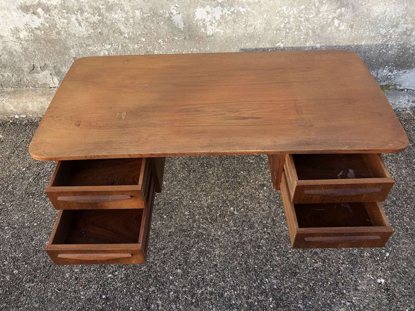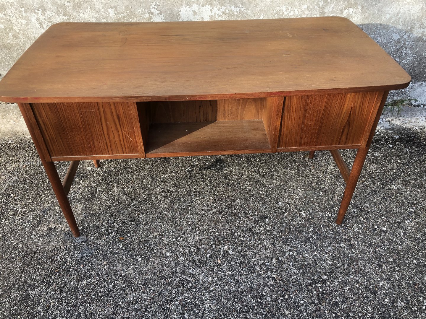 Fritstående skrivebord i teakfiner med rundede hjørner og let buet front.