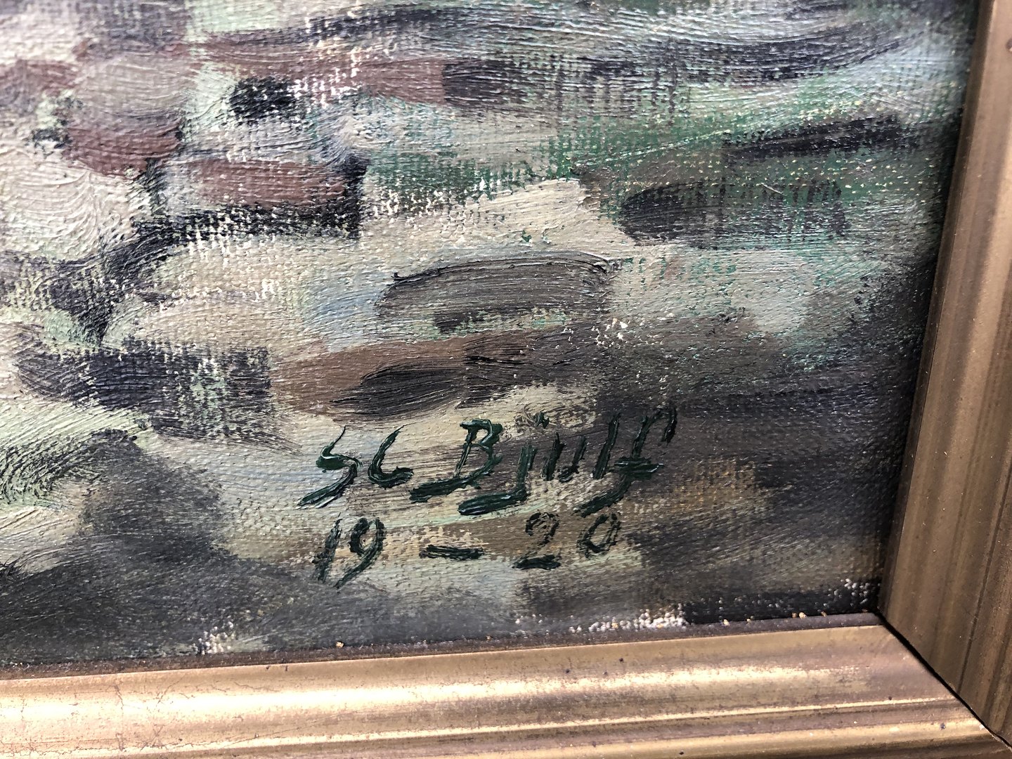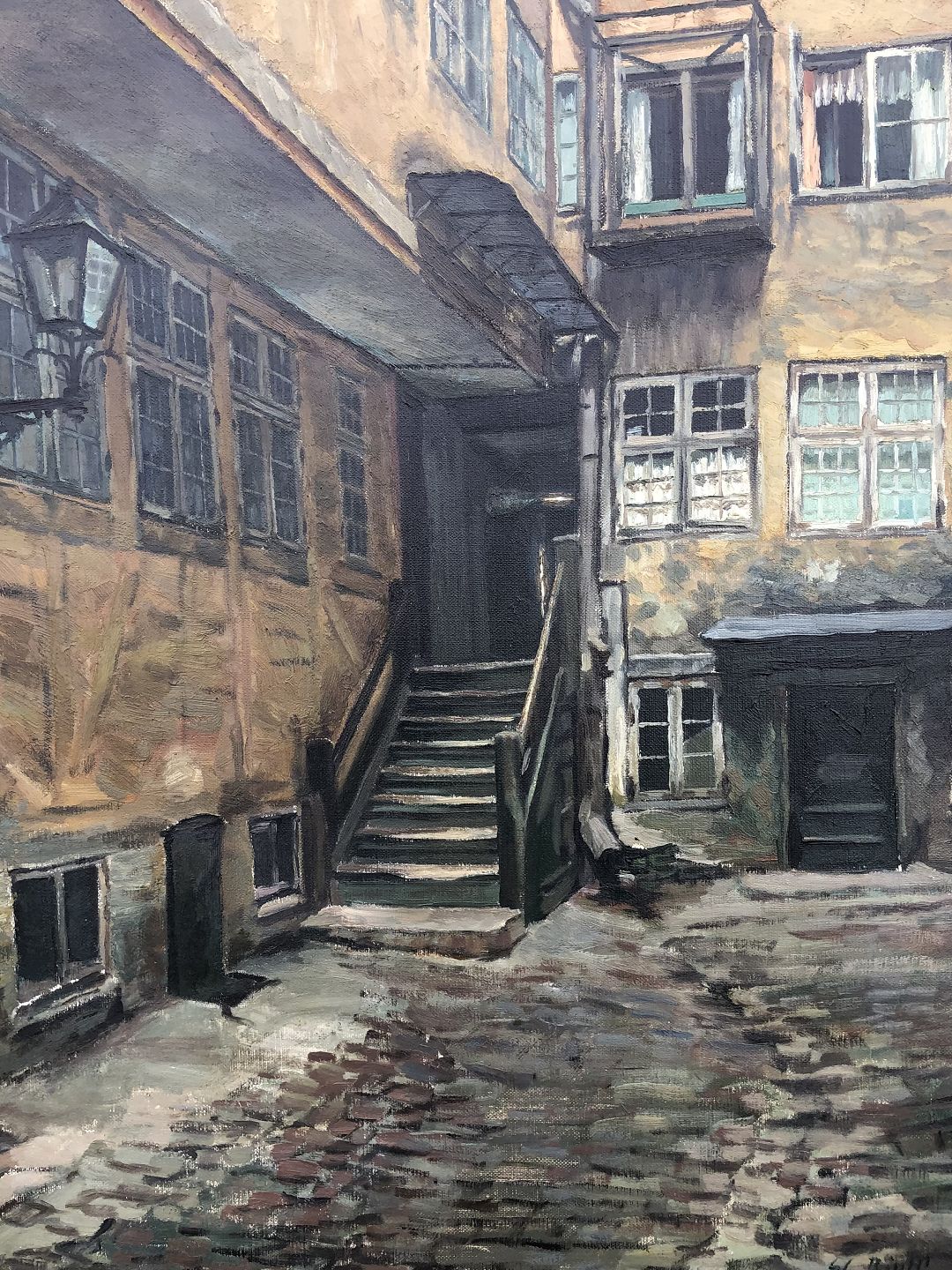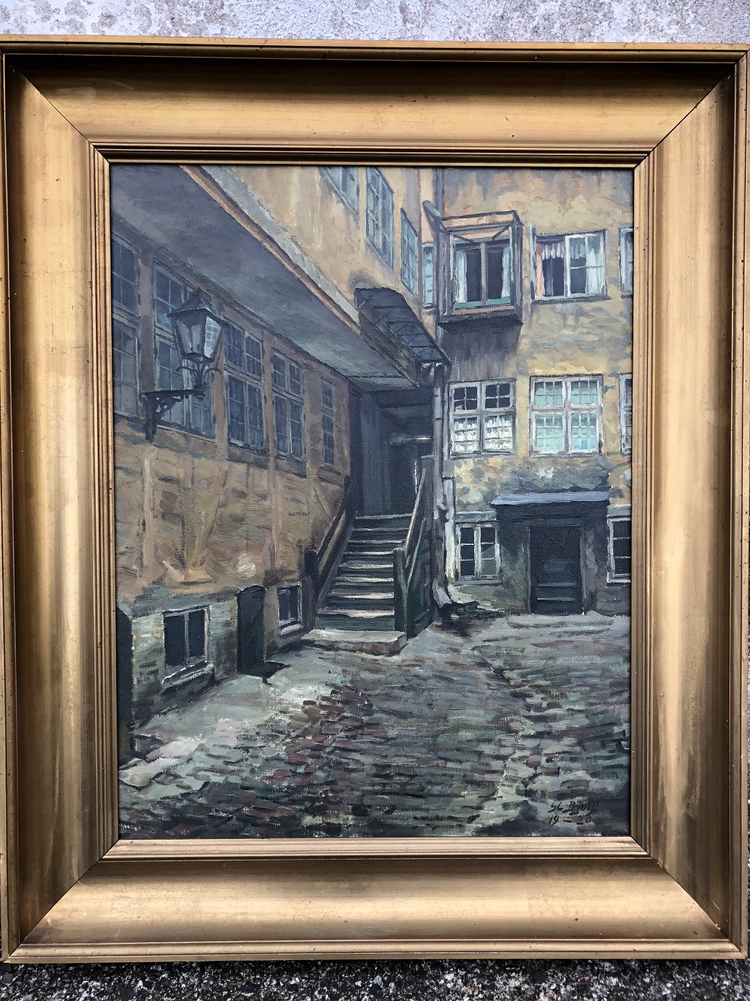 Søren Christian Bjulf (1890 - 1958), Maleri fra baggård på det gamle Christianshavn. Signeret: SC Bjulf 1920. Enkelte mærker på rammen ellers pæn stand. Mål med ramme 80x66 cm.