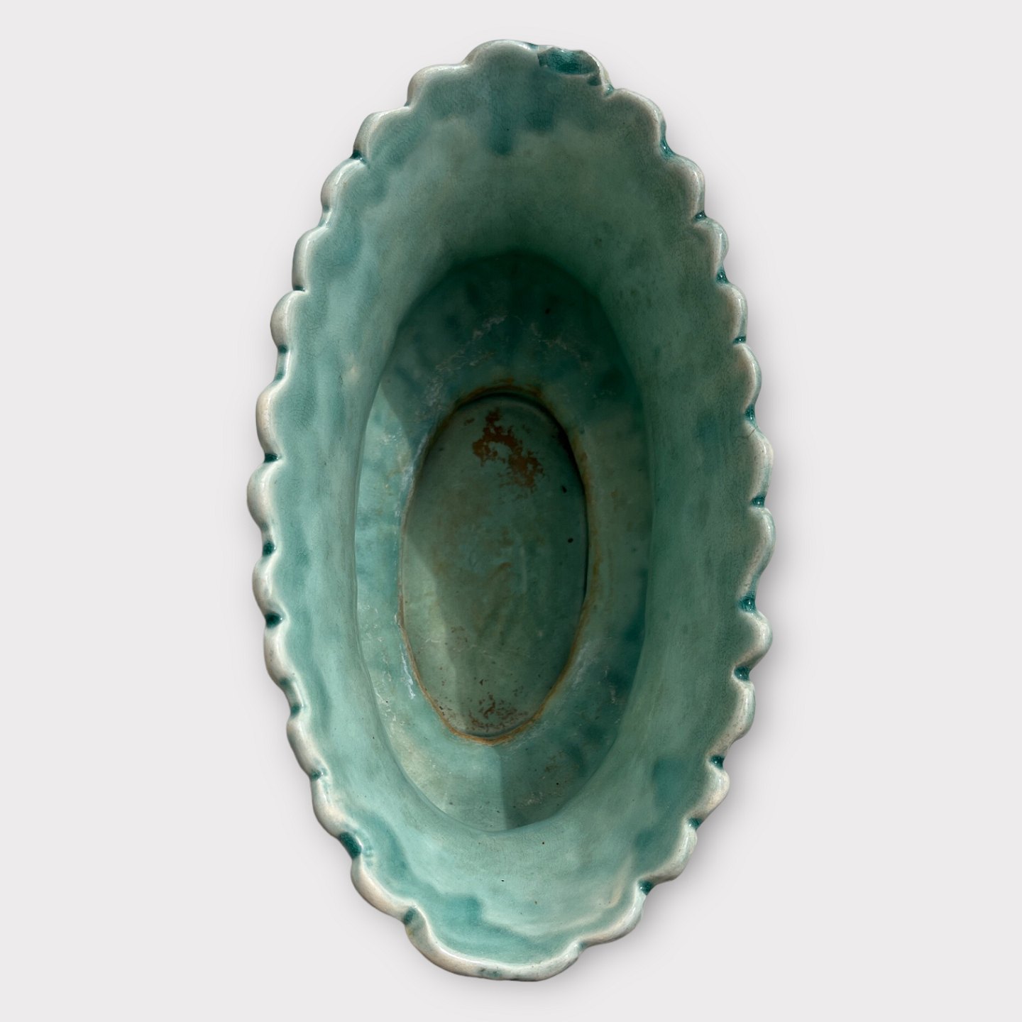 Fajance urtepotte, Majolica, Grønne glasur blomster, 26cm bred, 14cm dyb, 13,5cm høj *Med fejl under glasuren i kanten (se foto)*