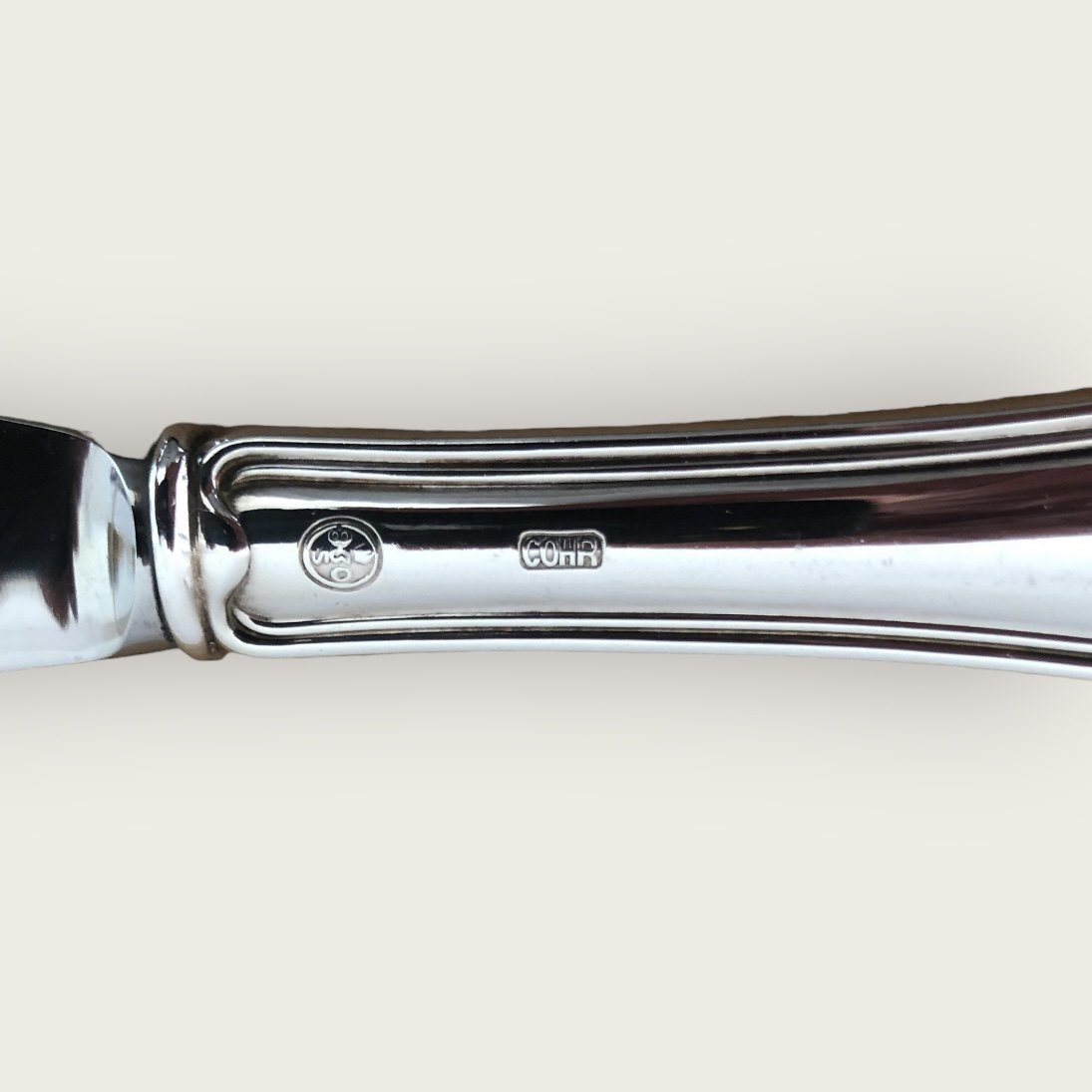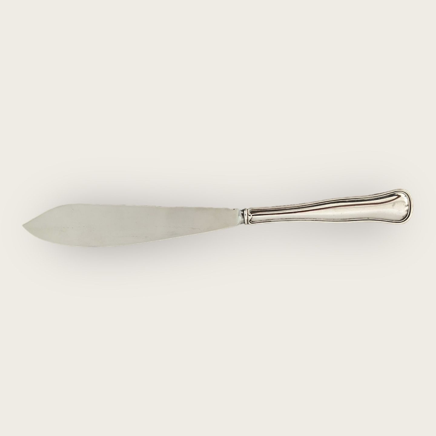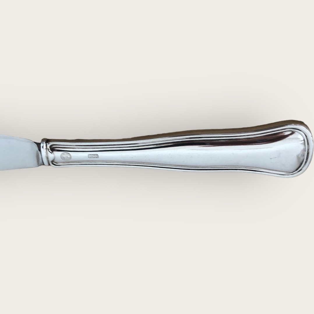 Double serrated, layer cake knife in steel and silver (830S) from Cohr. Nice used condition. 26 cm long.
