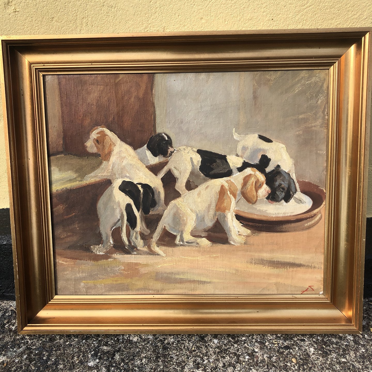 Oliemaleri på lærred, 6 hundehvalpe, Mål: 67x57 cm.