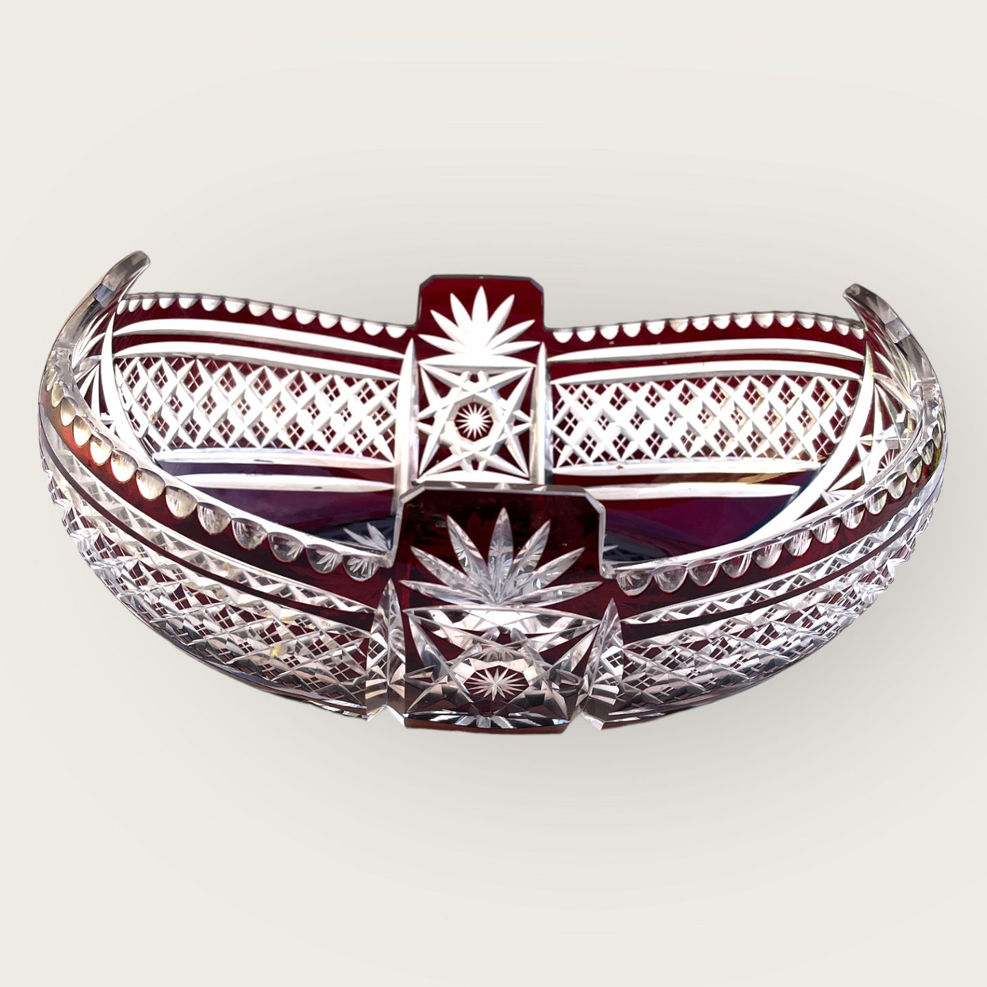 Bøhmisk glas, krystal jardiniere, Bordeux med slibninger, 29cm bred, 20cm dyb, 13cm høj *Perfekt stand*