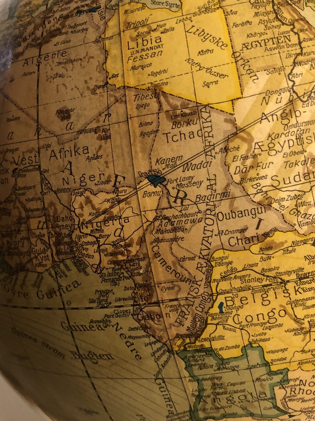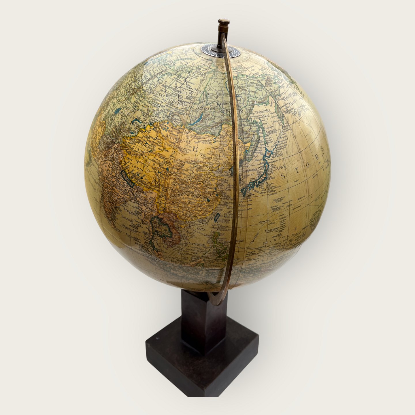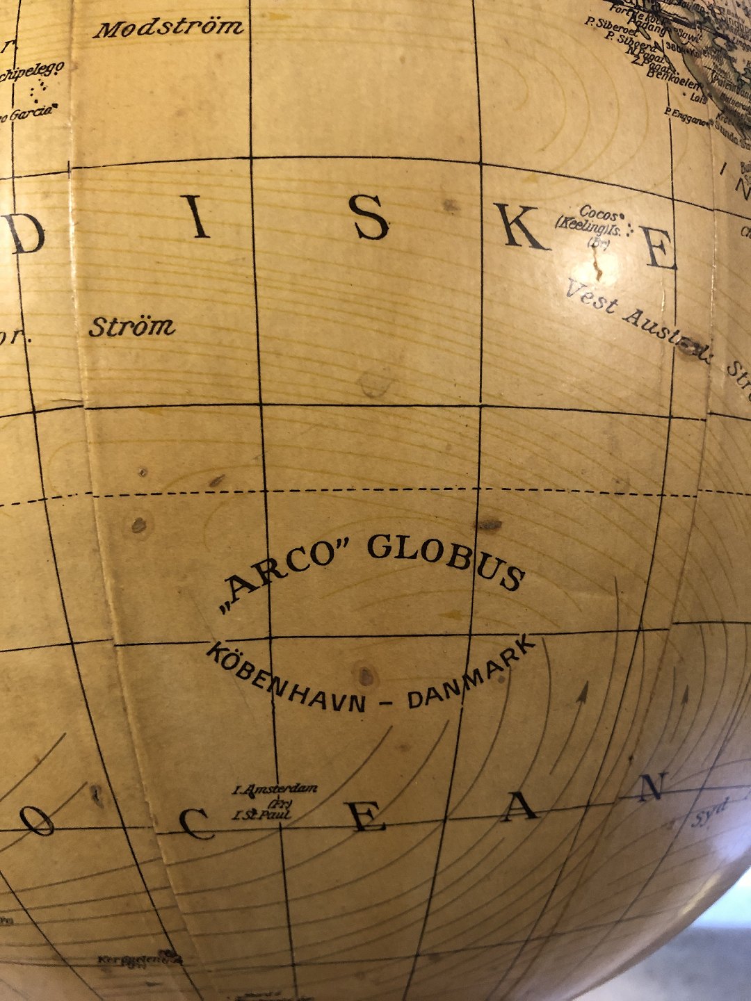 Old globe without light from "Arco" Globe, Copenhagen, 56cm high, Approx. 40cm wide, foot 14.5cm/14.5cm * The globe scratches a little on the hanger when it turns, otherwise nice patinated condition*