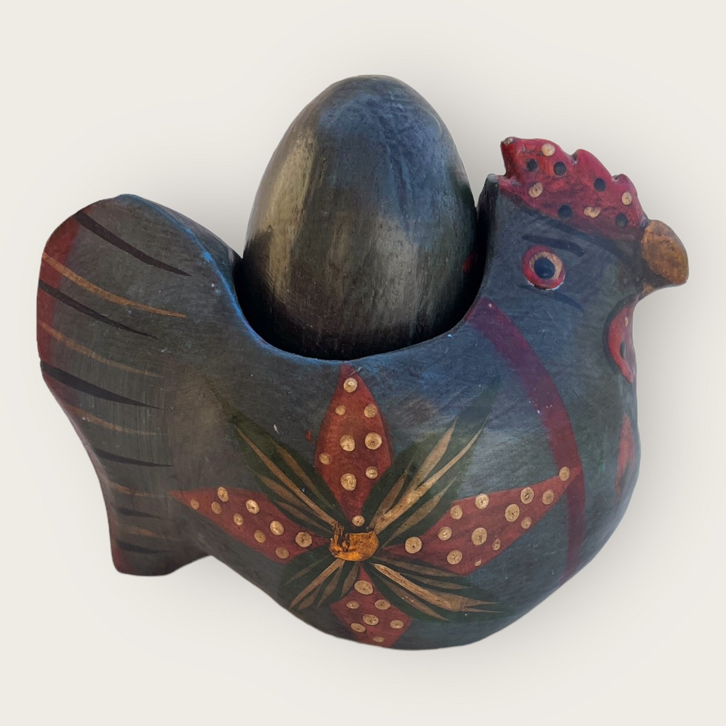 Ældre bemalet træhøne med et æg, Grøn med rød, gul mønster, 11cm bred, 9cm høj *Pæn stand*