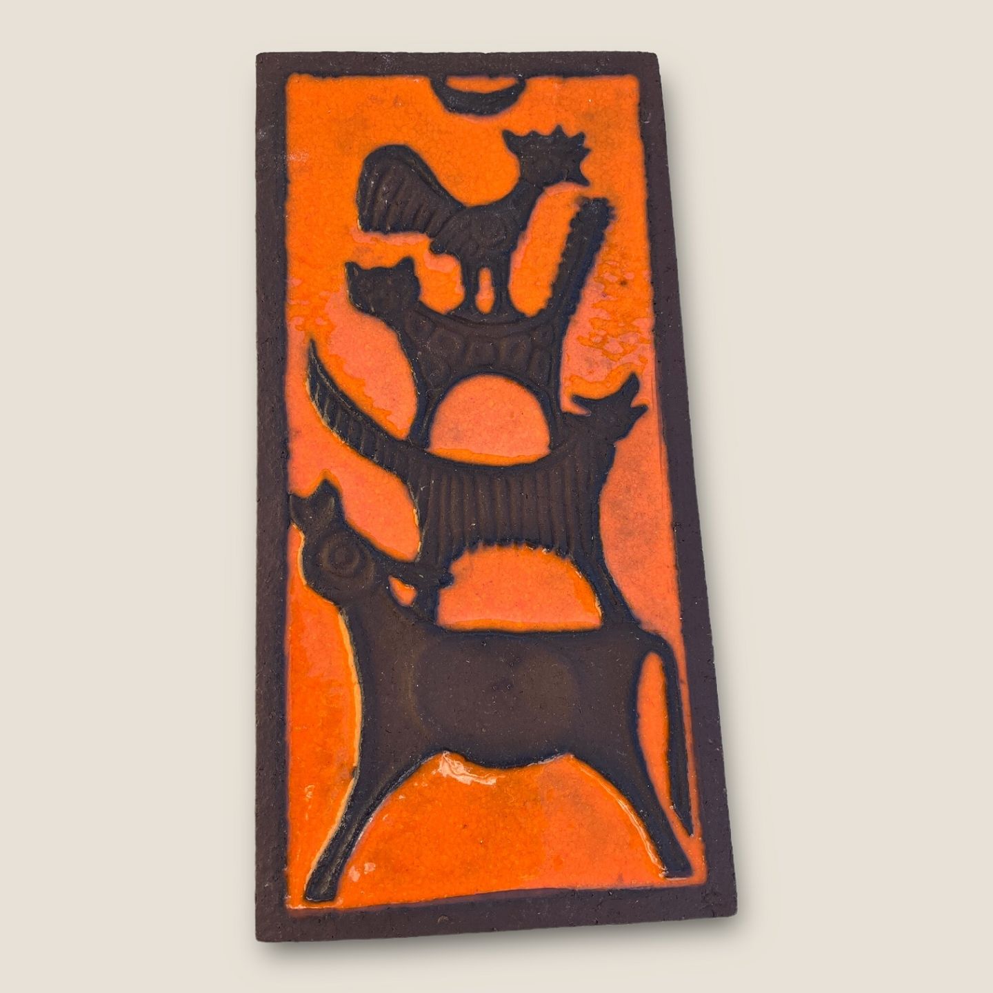 Knabstrup keramik, Relief, Dyr på dyr, 28cm høj, 14cm bred, Design Gunter Praschak *Pæn stand*
