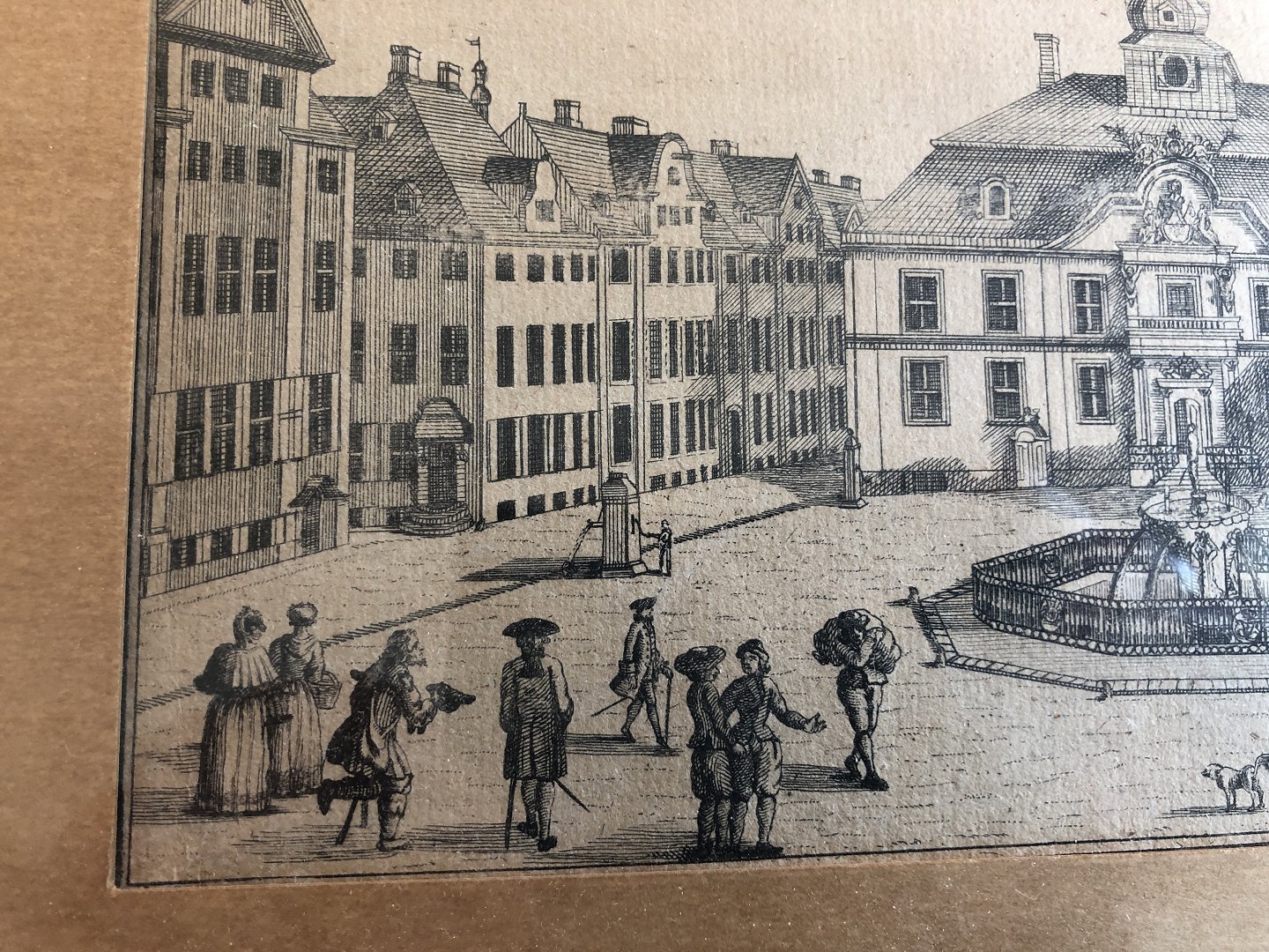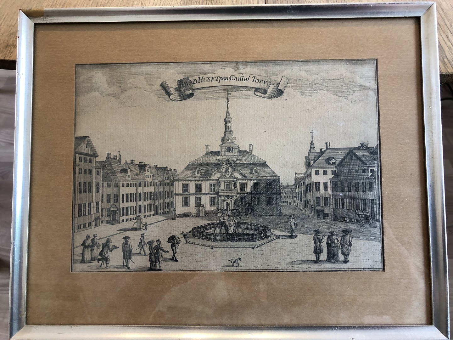 Ældre kobbertryk af Rådhuset på Gammel torv ( Rådhuset brændte i 1795), Indrammet i smal sølvfarvet ramme. Mål med ramme: 32x25,5 cm, Lysmål: 23,5x16 cm