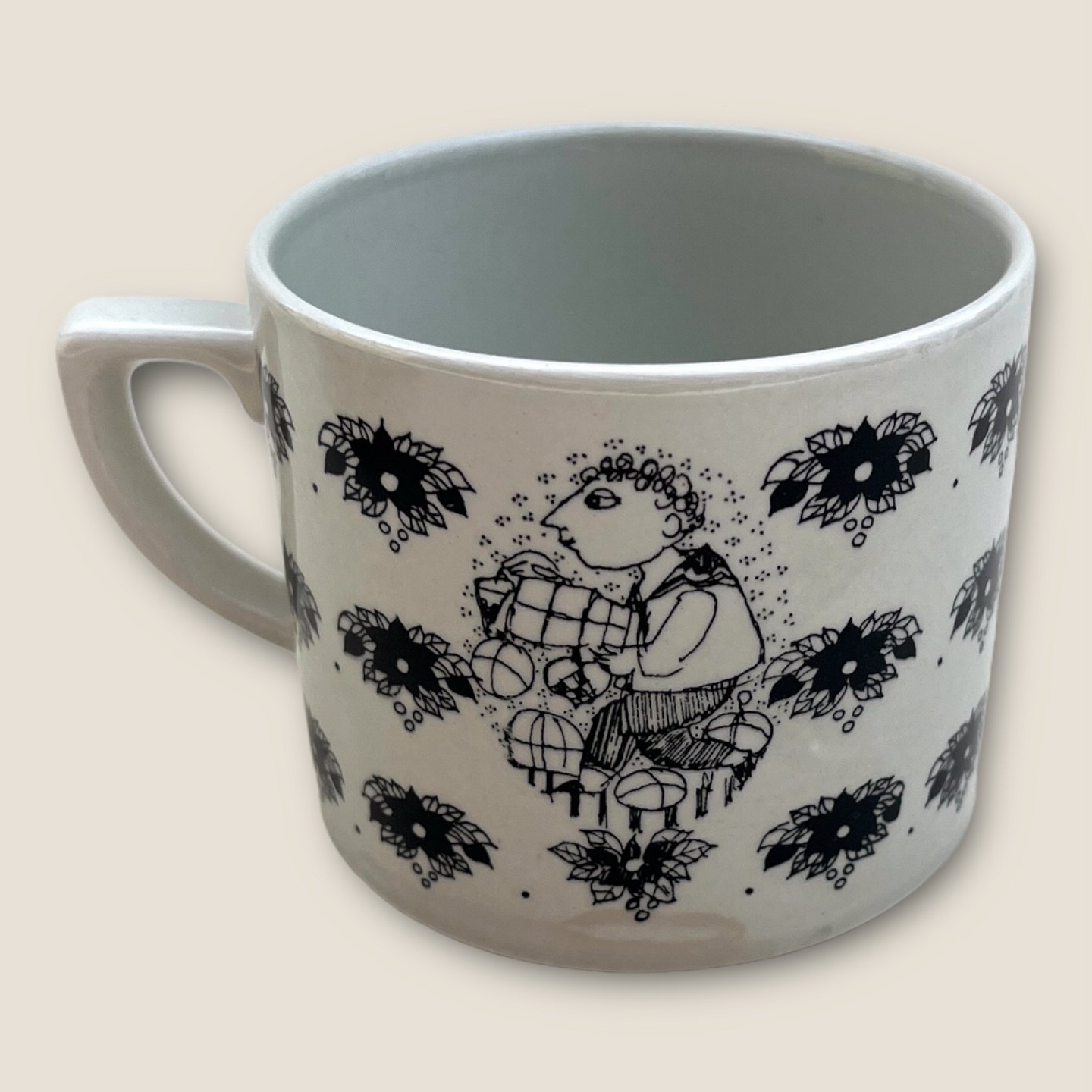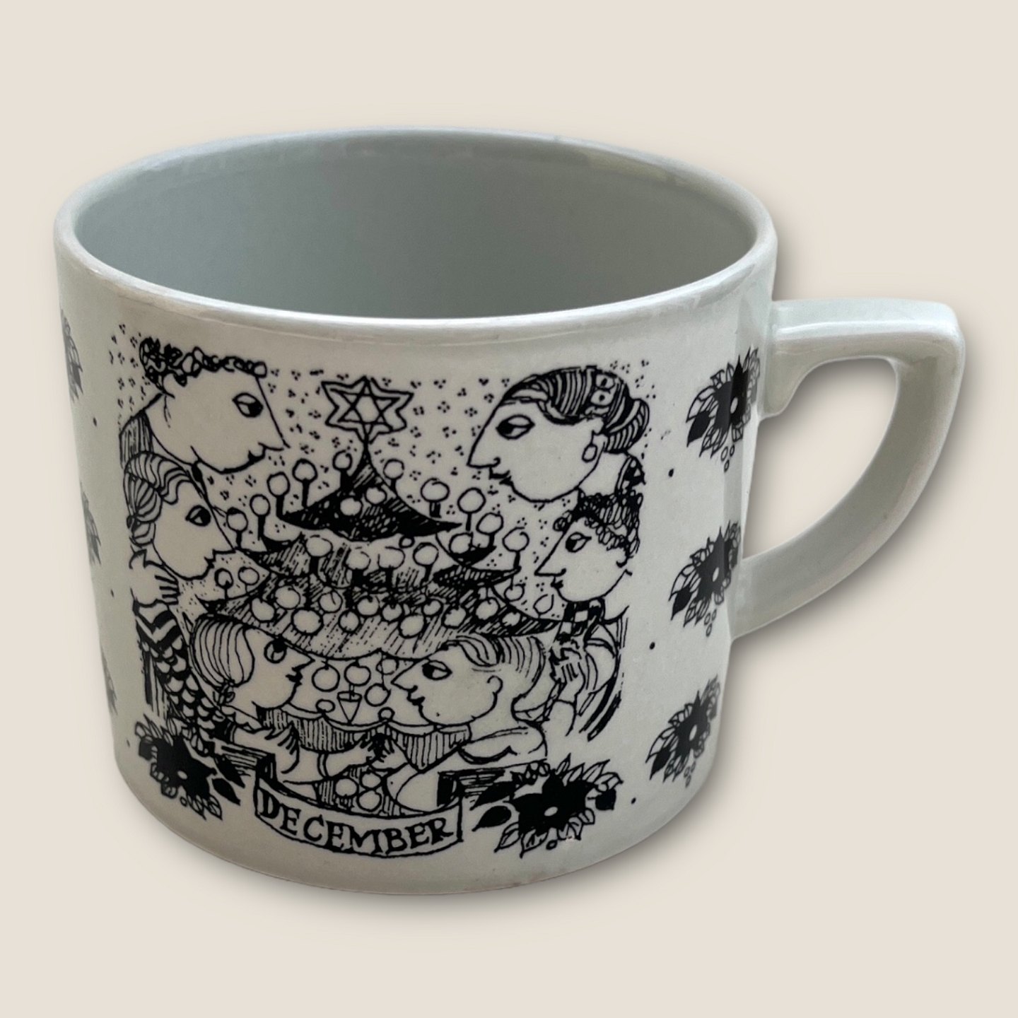 Bjørn Wiinblad, Måneds krus med tallerken, December, Sort tegning, 8cm i diameter, 7cm høj, Tallerken 15cm i diameter *Perfekt stand*