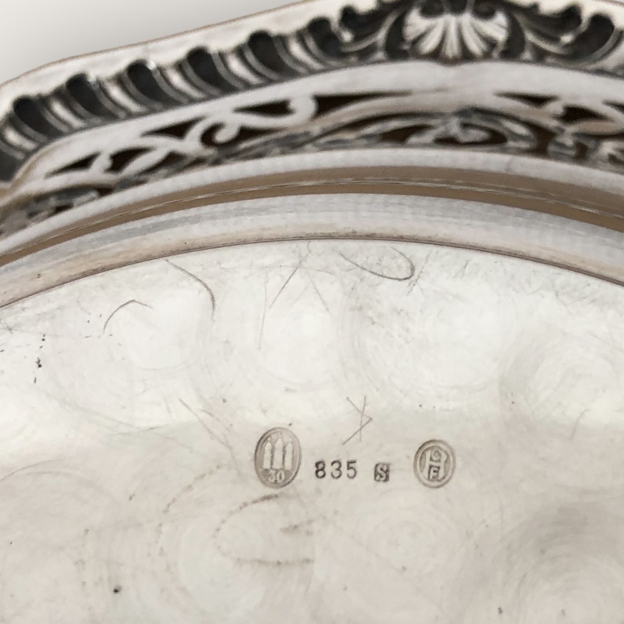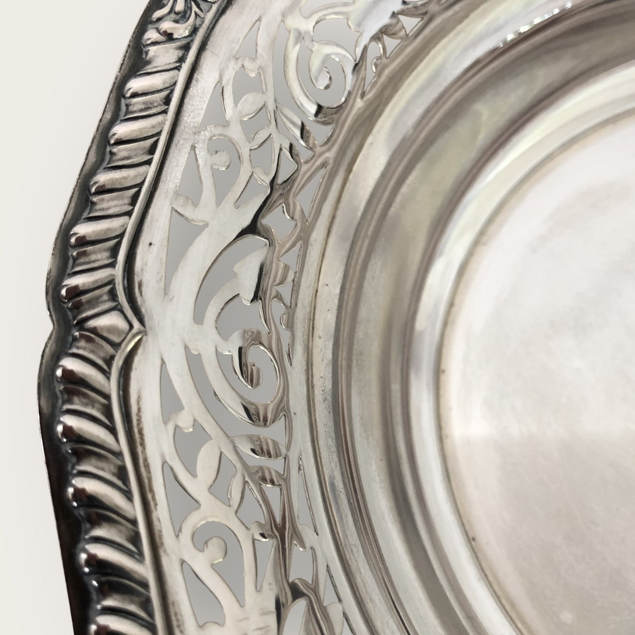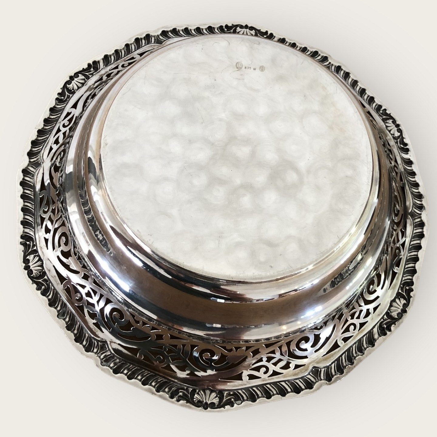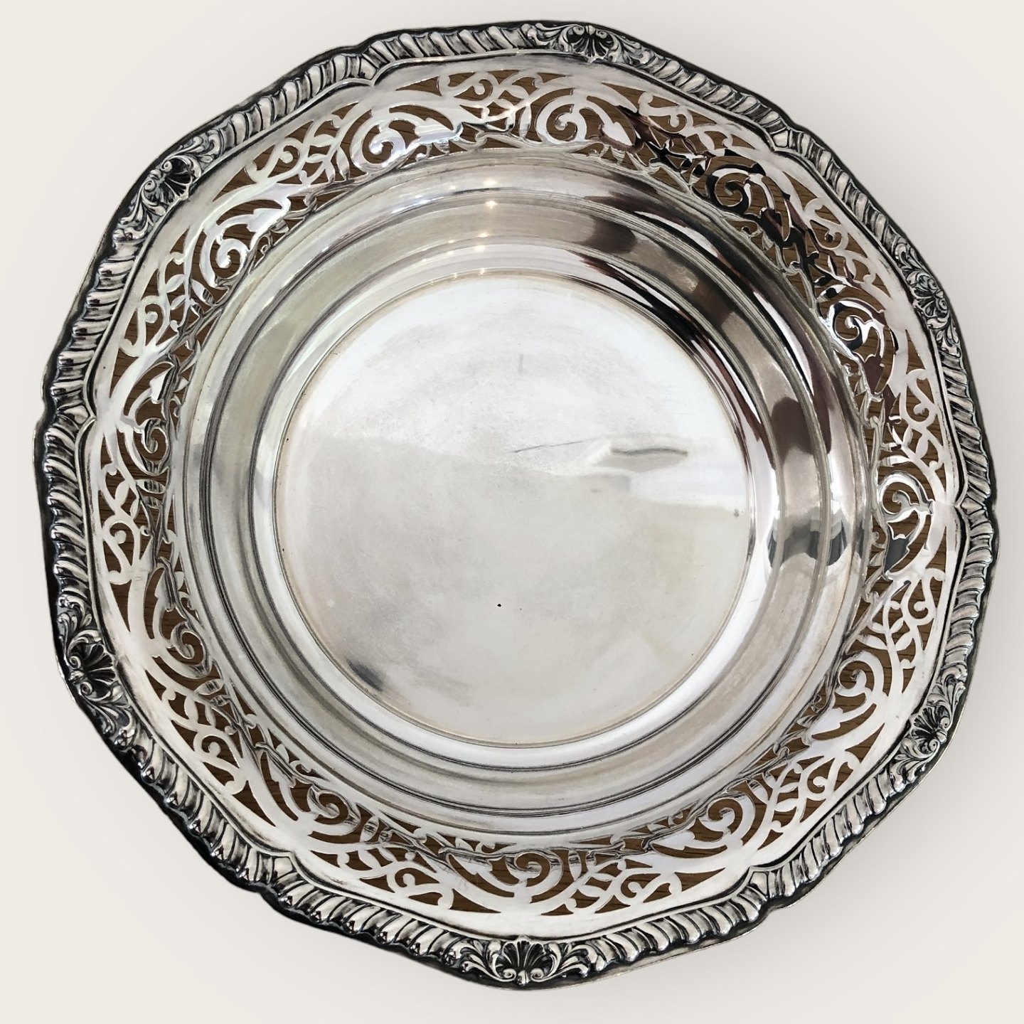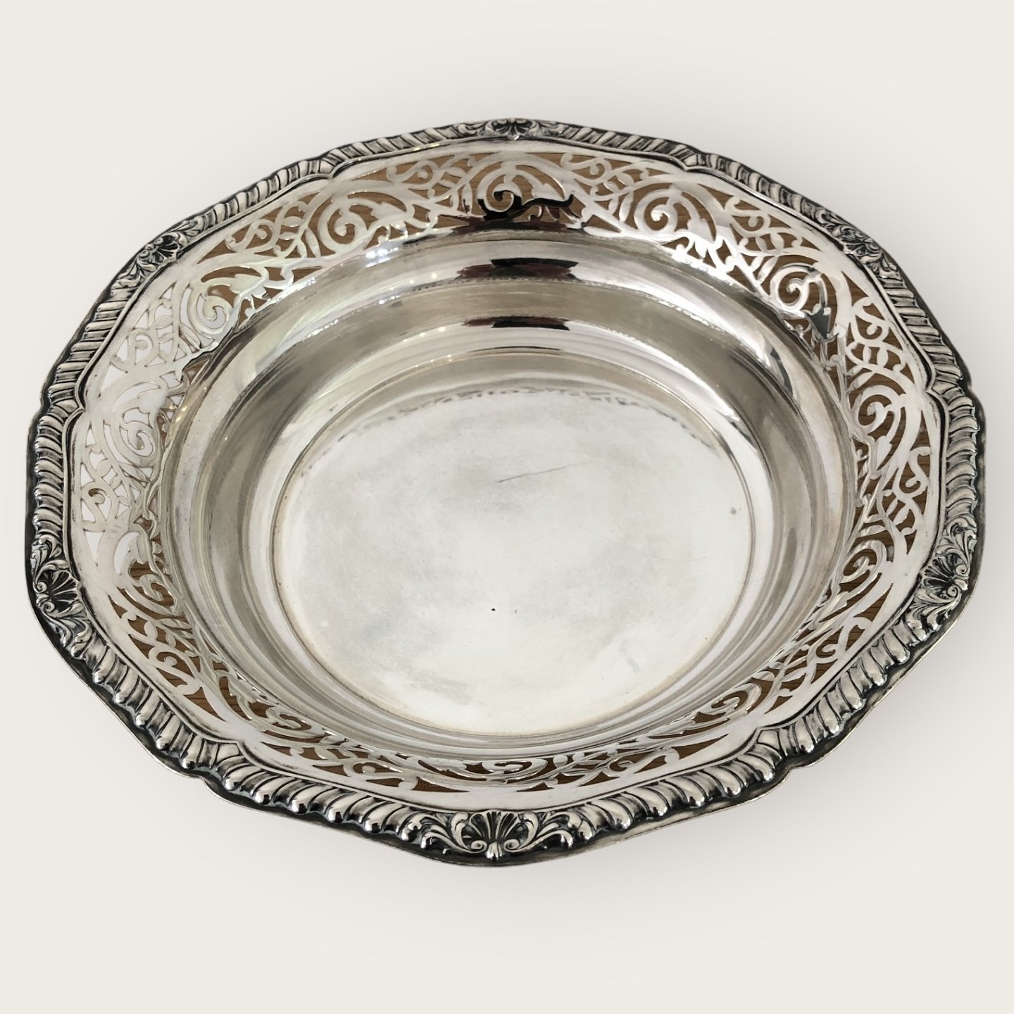 Sølvskål med gennembrudt kant fremstillet i 1930, diameter 21cm, vægt 170g, pæn brugt stand.
