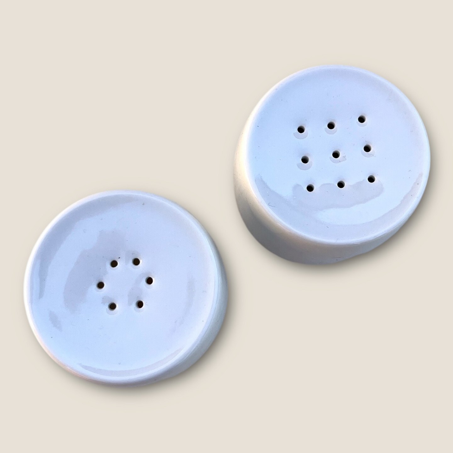 Royal Copenhagen, Hvidpot, Salt & Pebersæt, 6cm høj, 4,5cm i diameter, Design Grethe Meyer *Pæn stand*