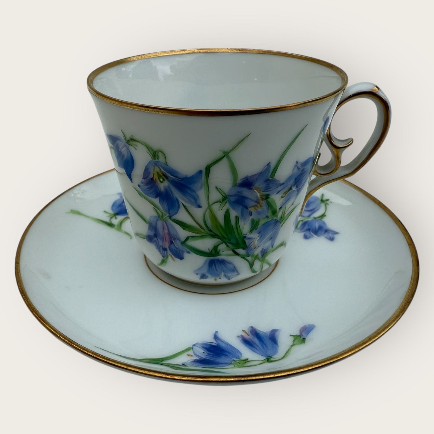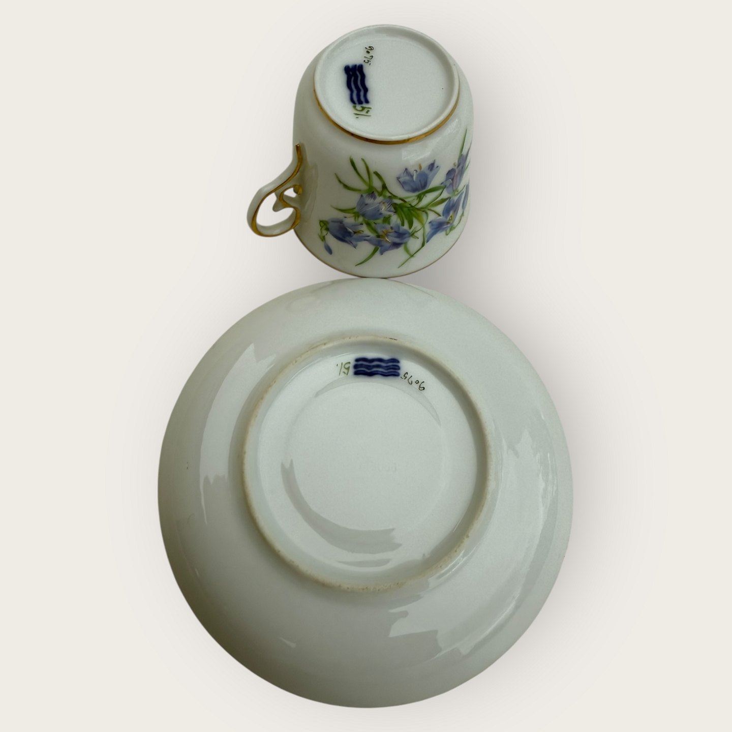 Royal Copenhagen, lille kaffekop i tyndt porcelæn dekoreret med "Liden klokke" (Campanula Rotundifolia), #9075, Kop højde 5,5cm, diameter 6,3cm, underkop diameter 8,5, Pæn stand