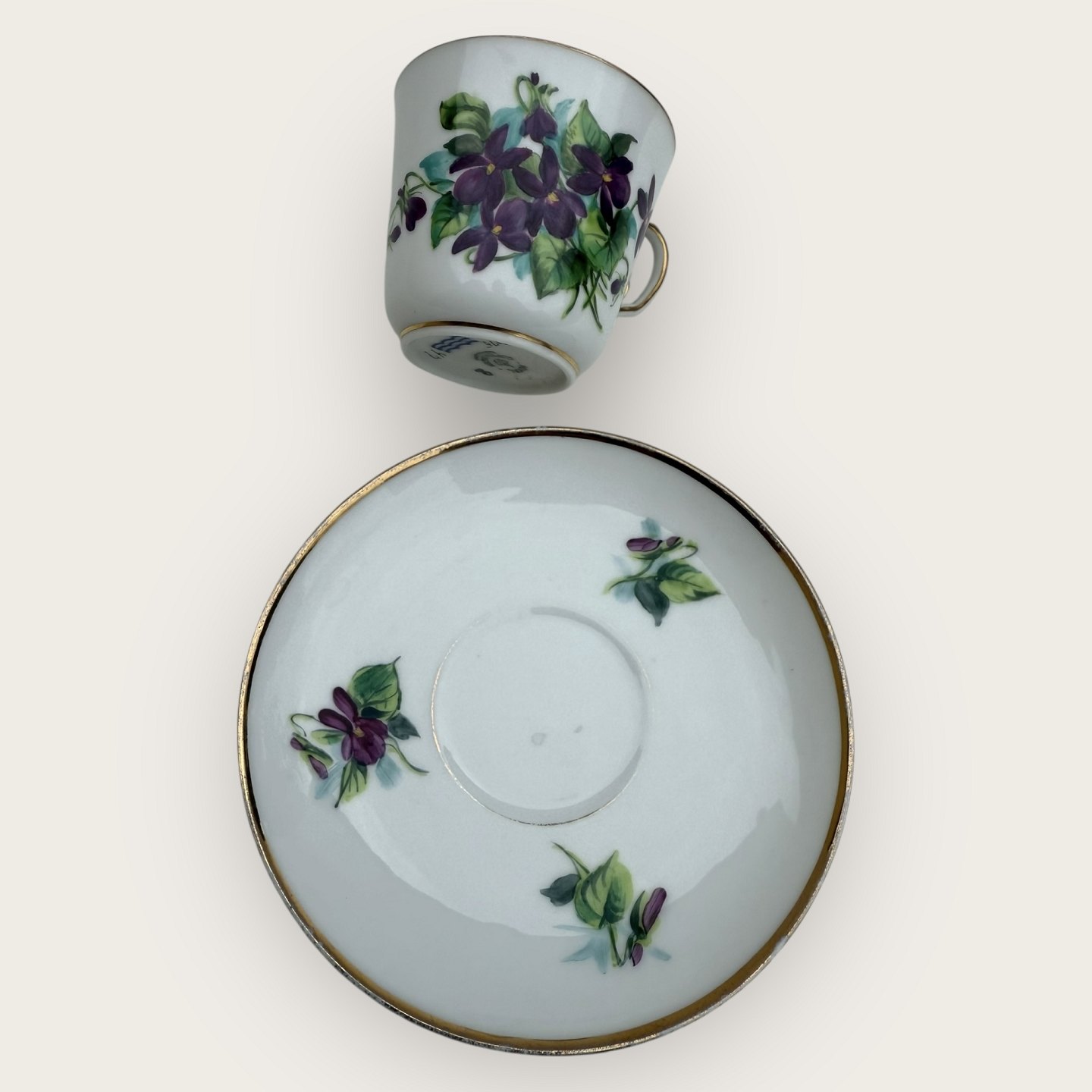 Royal Copenhagen, lille kaffekop i tyndt porcelæn dekoreret med Stedmoder blomster, #9075, Kop højde 5,5cm, diameter 6,3cm, underkop diameter 8,5, Lidt slid på guldkant ellers pæn stand