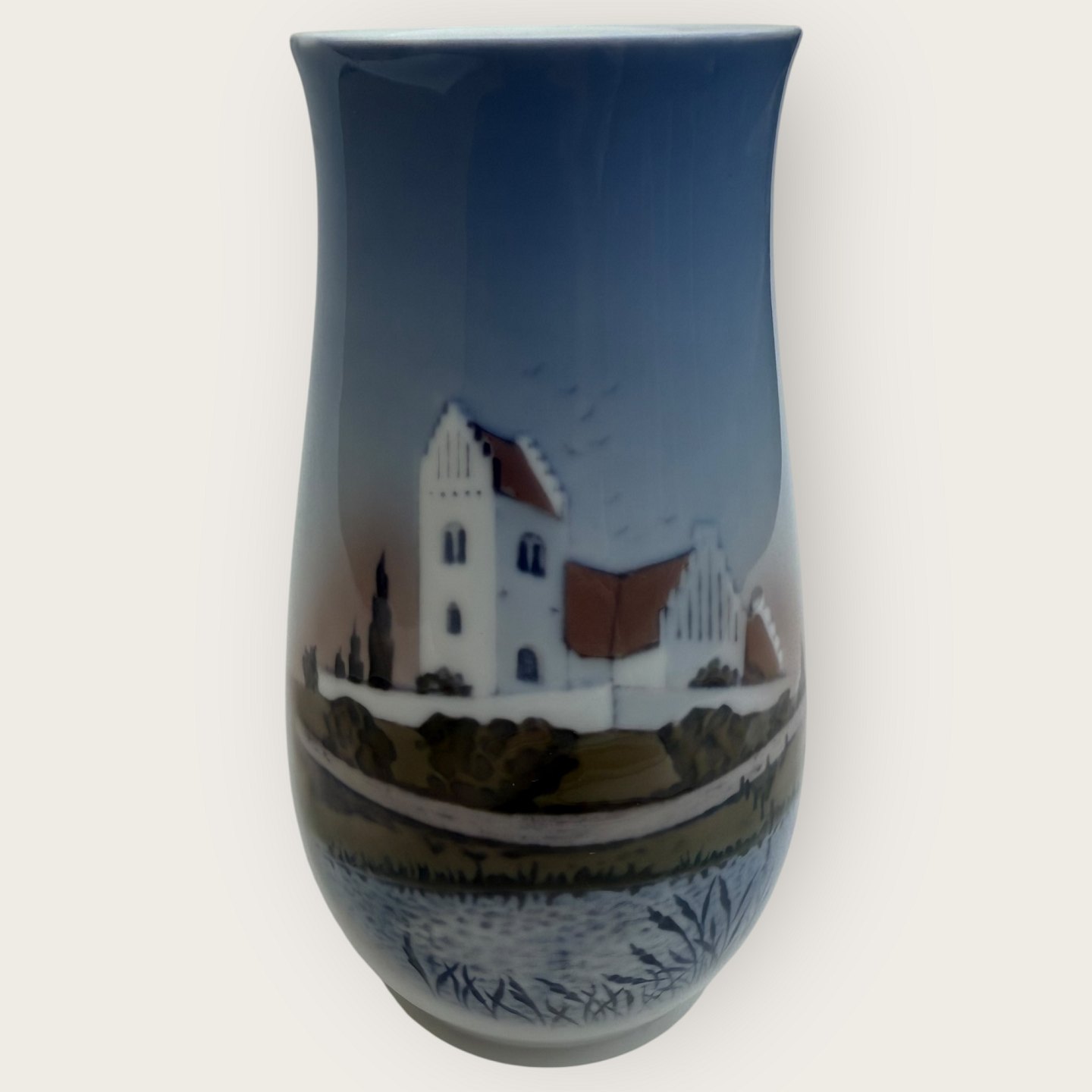 Bing & Grøndahl, Vase med hvid landsbykirke, # 1302/6210, højde 17,2cm, 1. sortering, fin stand.