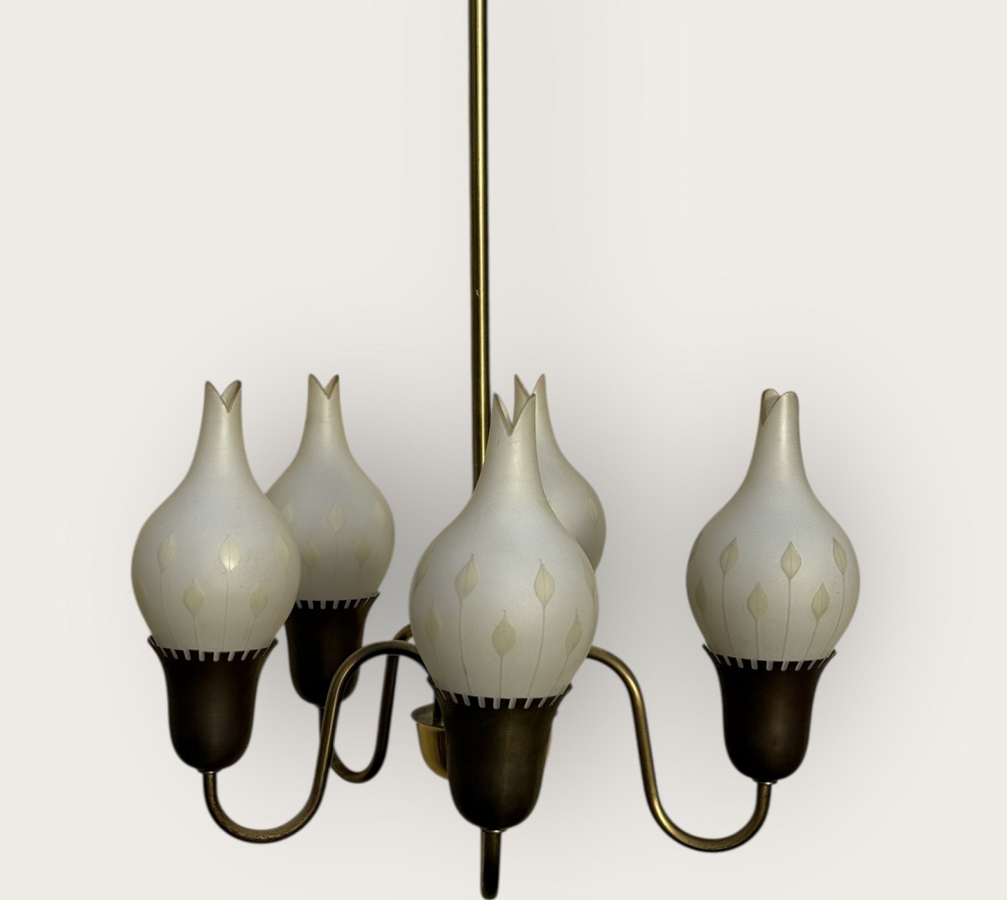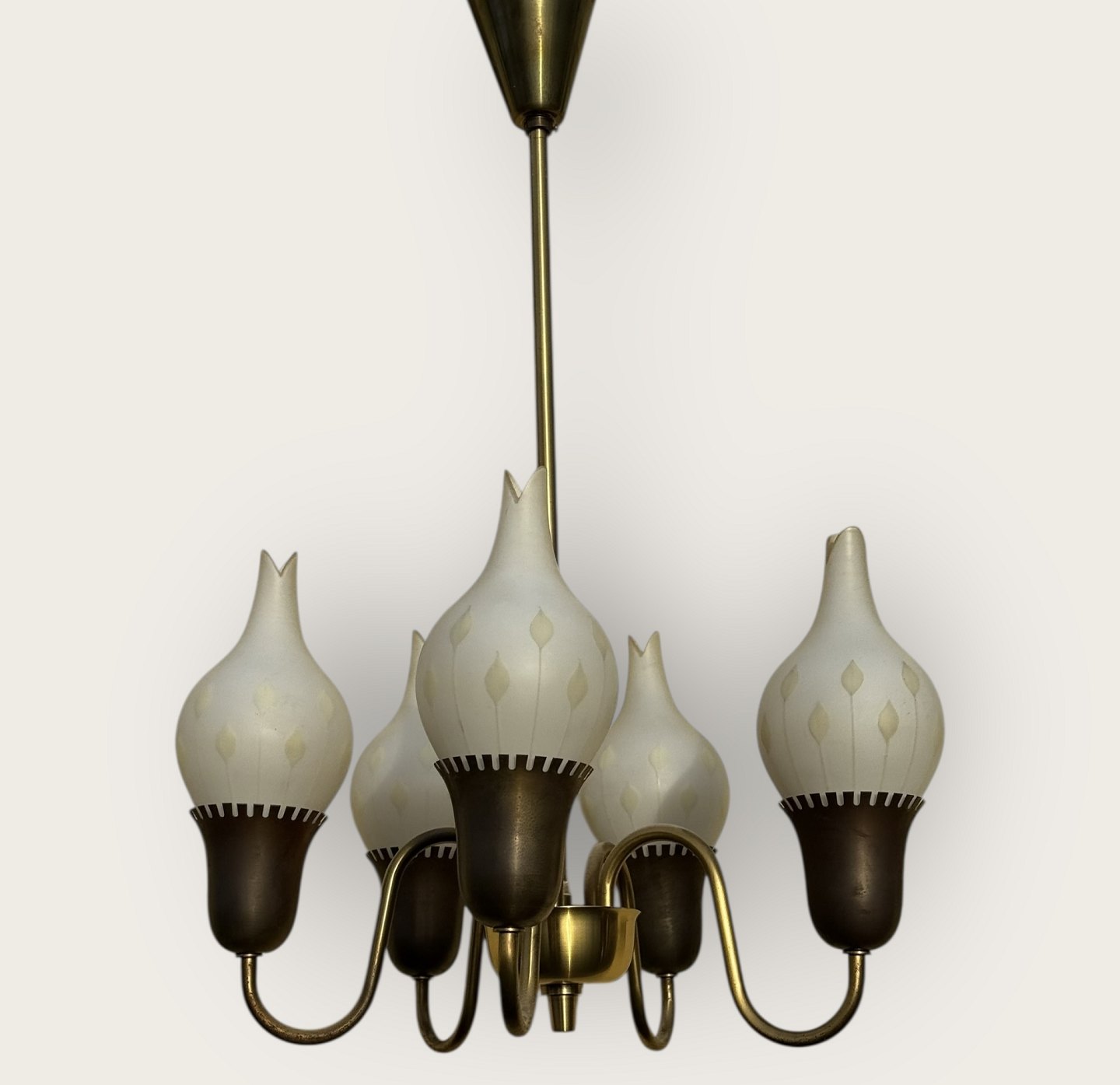 Lysekrone i messing med glasskærme, 5 store skærme i tulipan form, Sandsynligvis fremstillet hos Fog og Mørup, hver skærm er ca. 20cm høj og 10cm i diameter, selve lampen er 42cm i diameter og 67cm høj *Flot stand*