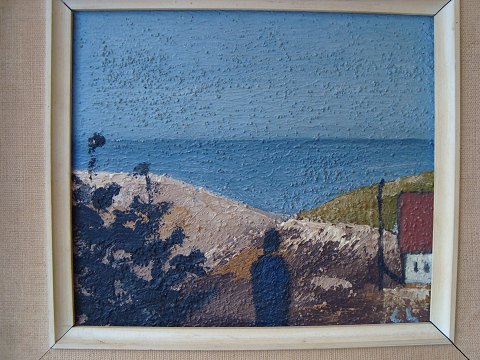 Ubekendt kunstner (20 årh): Nordjysk kystparti med mørk person i forgrunden. Olie på plade. Sign.: CL eller CC (for mig ubekendt signatur) 16x18 (28x31)