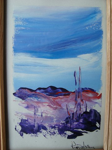 Kurt Olsson (20 årh): Klitparti i blå-lilla farver. Sign.: Kurt Olsson 14x9 (18x12½) Kurt Olsson har atelier i Jernbanegade, Aalborg.