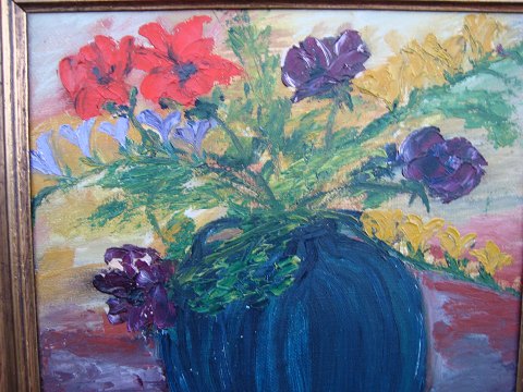 Lilly Höegh (20 årh): Blomster i stor kugleformet vase. Olie på lærred. Sign.: Lilly Høegh 23x23 (30 x30)