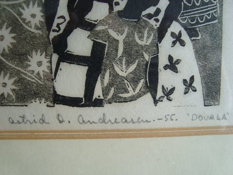 Astrid O. Andreasen (20 årh): Motiv fra Douala. Douala er en havneby i Cameroun. Træsnit på japanpapir Sign.: Astrid O. Andreasen - 56. Eget tryk. Betegnet "Douala" 23x33 (31x41)