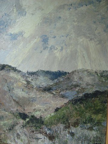 Carl Johan Tandrup (1921-92): Parti fra Rebild 1968. Olie på lærred. Bagpå betegnet - "Soldrivende skyer Rebild - Sigt mod Rold Skov 1968" Sign.: Carl Johan Tandrup 59x45 (66x52)