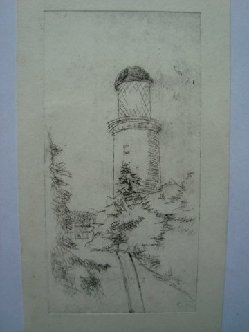 Bent Holstein (født 1942): "vej op mod fyrtårn" Original radering. Usigneret. Selve bladet - 20x10½ Indrammet - 24x18