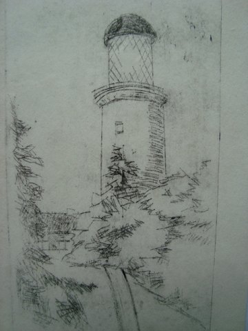 Bent Holstein (født 1942): "vej op mod fyrtårn" Original radering. Usigneret. Selve bladet - 20x10½ Indrammet - 24x18